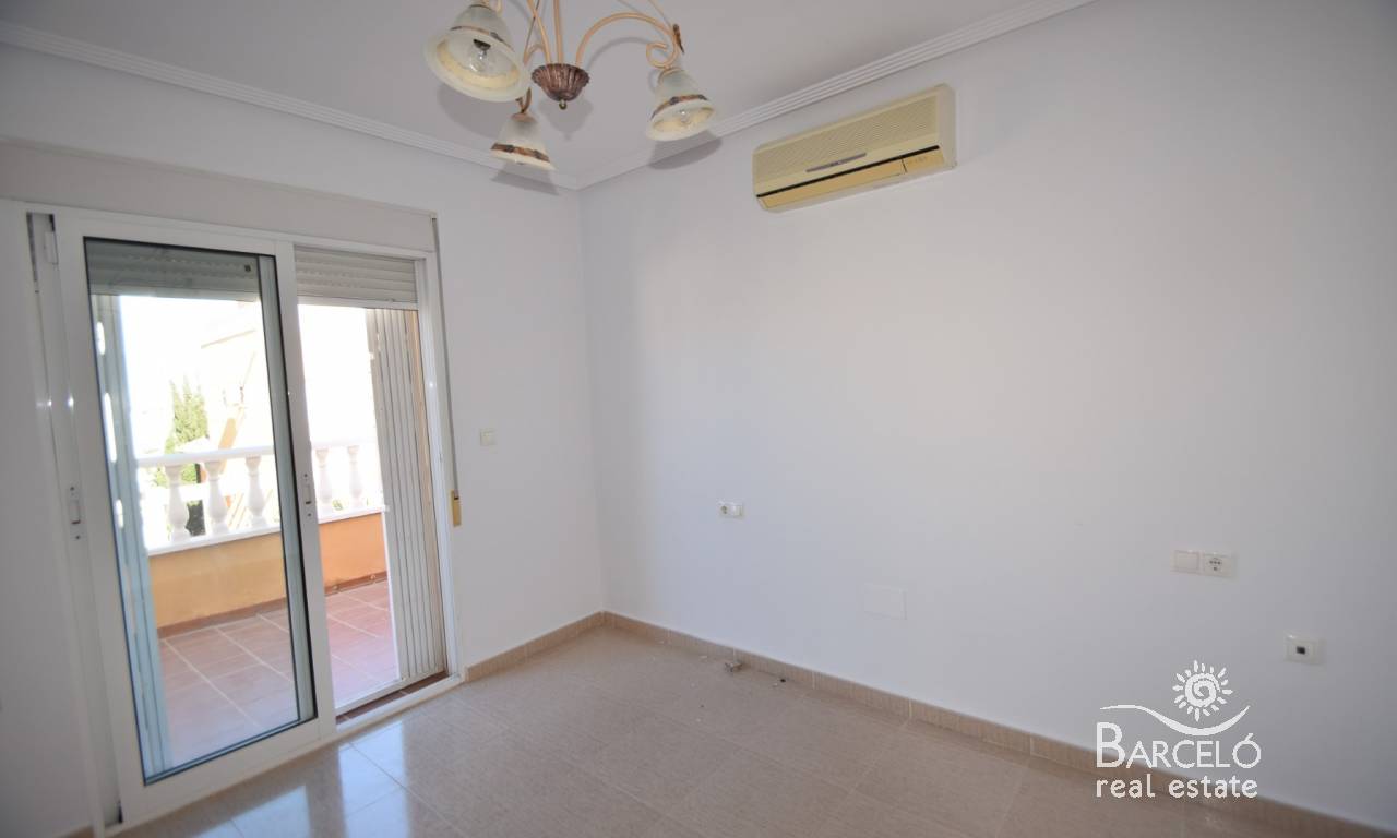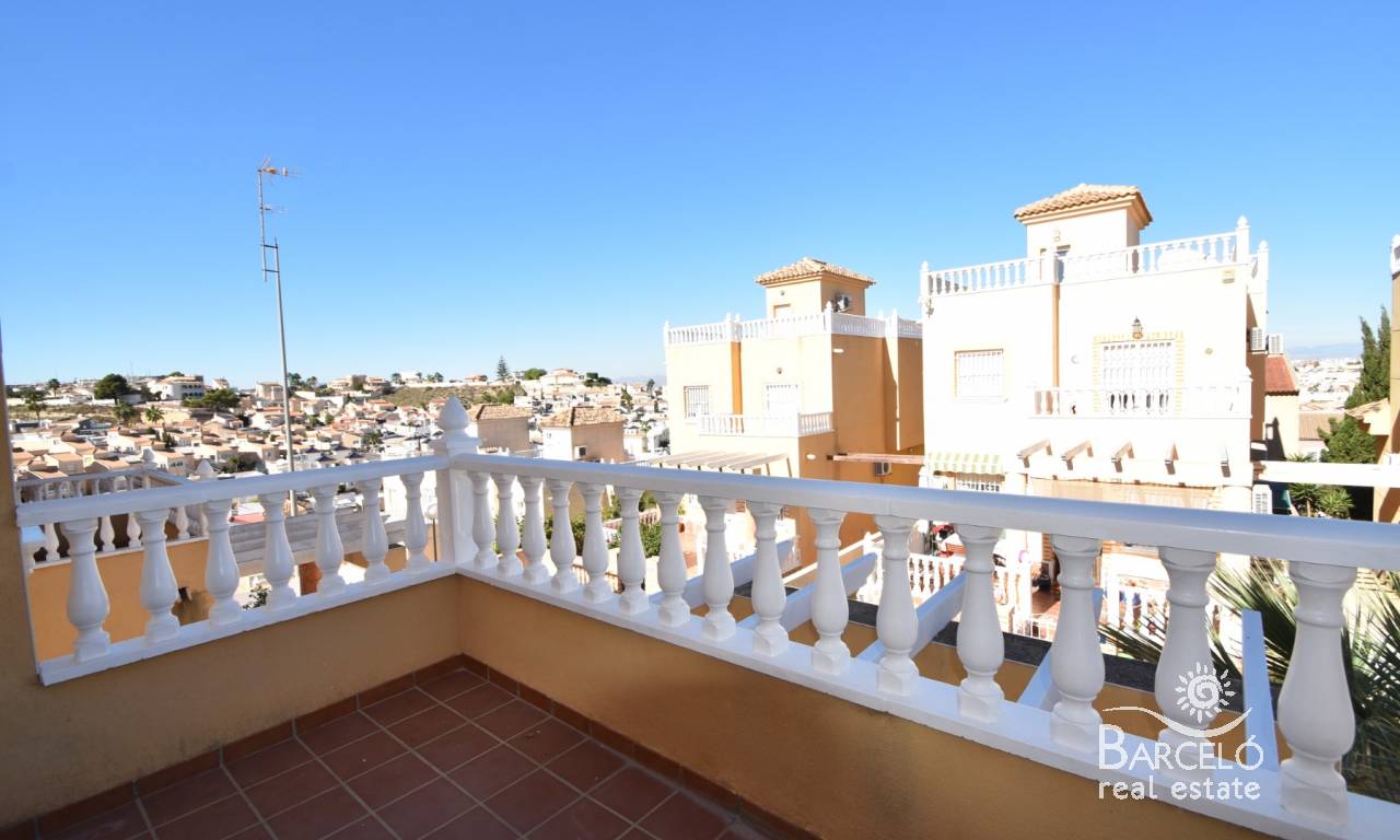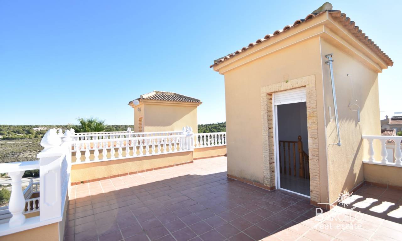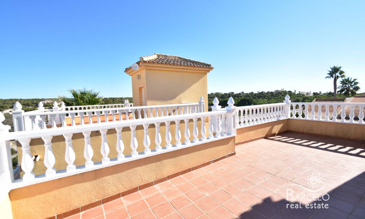 Im Obergeschoss befinden sich drei Doppelschlafzimmer, jedes mit Einbauschränken und Klimaanlage, und zwei davon verfügen über eine eigene, private, sonnige Terrasse. Auf dieser Etage befindet sich auch ein Familienbadezimmer. Auf der oberen Ebene gibt es ein großes Solarium mit Blick auf die Umgebung und den Golfplatz.