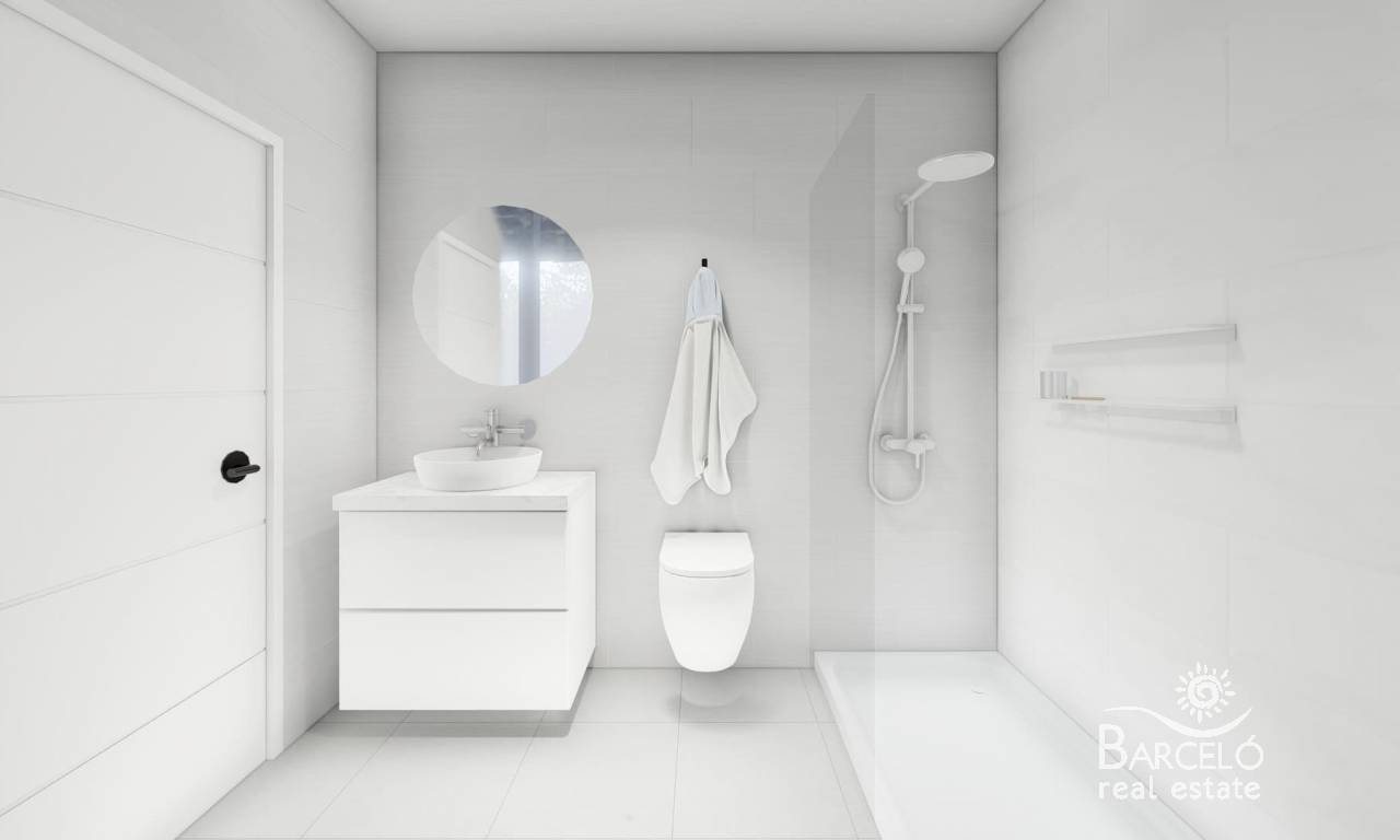 Elegante Badezimmer mit Wandschränken, LED-beleuchteten Spiegeln und Duschwänden.