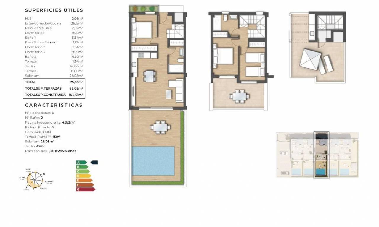 NEU GEBAUTE STADTHÄUSER IN TORREVIEJA New Build Wohn von 5 schönen Eigenschaften mit privaten Swimmingpools in Torrevieja. Schöne Stadthäuser hat 3 Schlafzimmer, 2 Bäder, offene Küche mit Wohnzimmer, Einbauschränke, Terrasse, private solarium mit Grillplatz, Garten mit dem Pool und comunal Parkplatz. Eigenschaften mit hochwertigen Materialien und Oberflächen gebaut. Die unglaubliche Lage, nur 5 Minuten vom Meer entfernt, und die Nähe zu den wichtigsten Einkaufs- und Freizeitzentren von Torrevieja sowie zu den Golfplätzen, machen es zu einem einzigartigen und exklusiven Ort zum Leben. Torrevieja ist eine spanische Stadt in der Provinz Alicante, an der Costa Blanca. Sie ist bekannt für ihr typisch mediterranes Klima und ihre Küstenlinie. Entlang der Sandstrände gibt es Strandpromenaden mit Ferienanlagen. Das kleine Meeres- und Salzmuseum beherbergt Ausstellungen über die Fischerei- und Salzgeschichte der Stadt. Im Landesinneren befindet sich der Naturpark Lagunas de La Mata-Torrevieja mit Wanderwegen und zwei salzhaltigen Lagunen, von denen eine rosa und die andere grün ist. Der Flughafen Alicante ist 40 Minuten und der Flughafen Murcia etwa 1 Stunde entfernt.