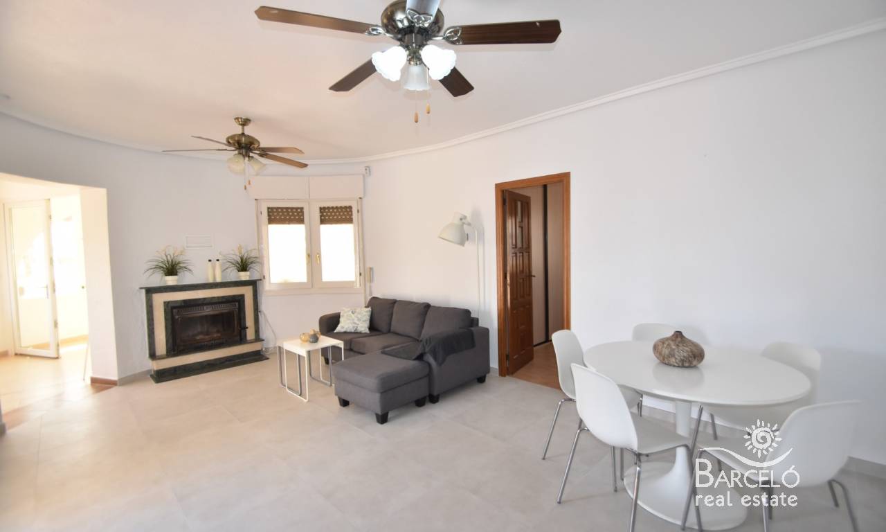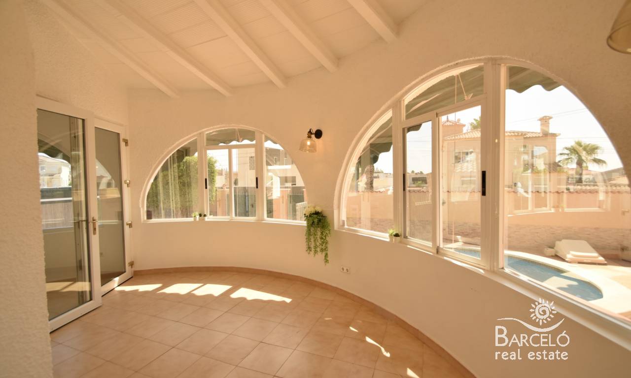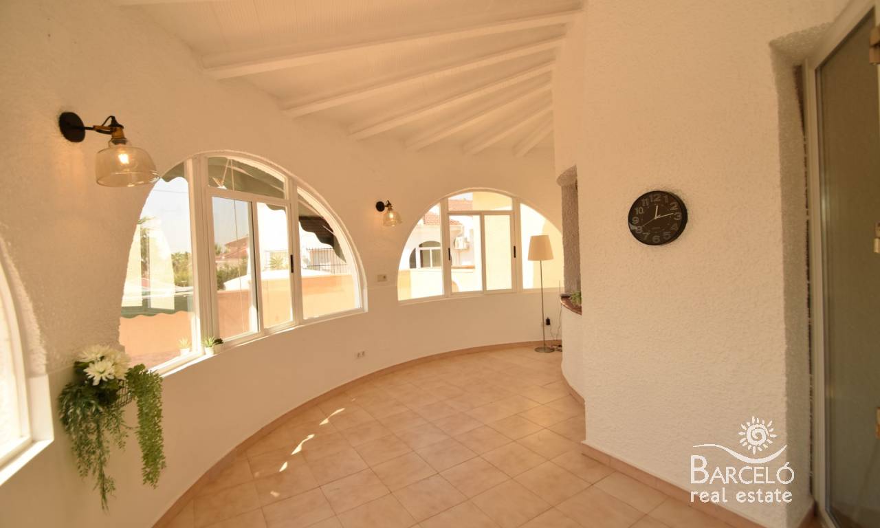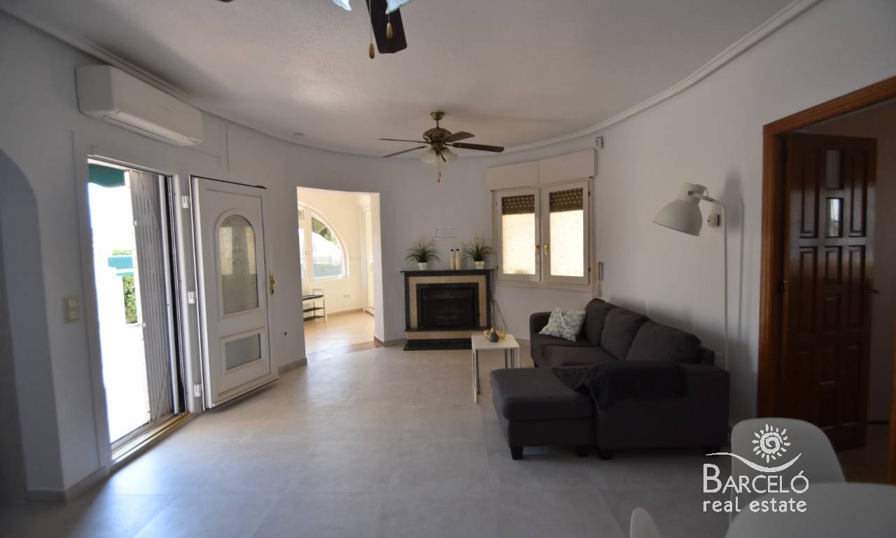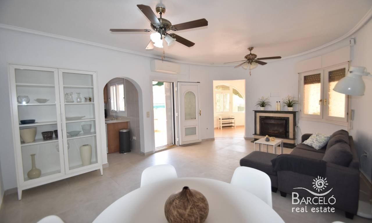 La villa en sí está construida en dos niveles y consta de la casa principal en la planta baja y un anexo independiente arriba. Entrando a la casa principal tiene una pequeña terraza con puerta de entrada al salón, donde tiene una acogedora chimenea y aire acondicionado. Hay una terraza curva con vistas a la piscina y al jardín y ha sido acristalada con ventanas para crear un lugar fantástico para pasar los días de invierno y verano por igual. Desde el salón se accede a una cocina independiente con todos los electrodomésticos, y hay tres dormitorios dobles y un baño familiar grande y moderno.