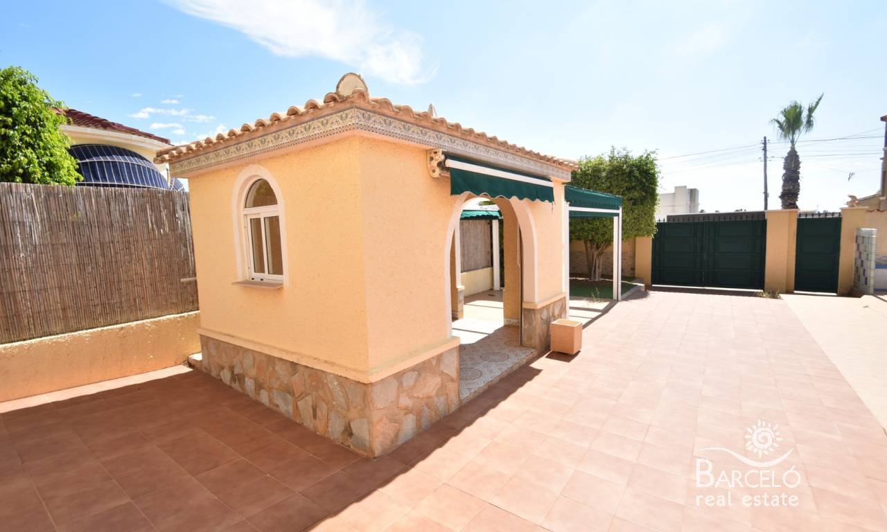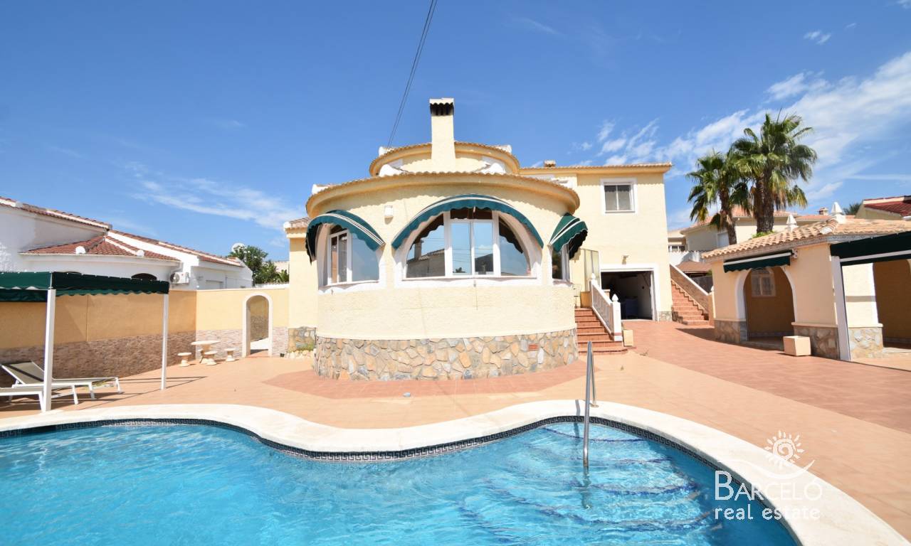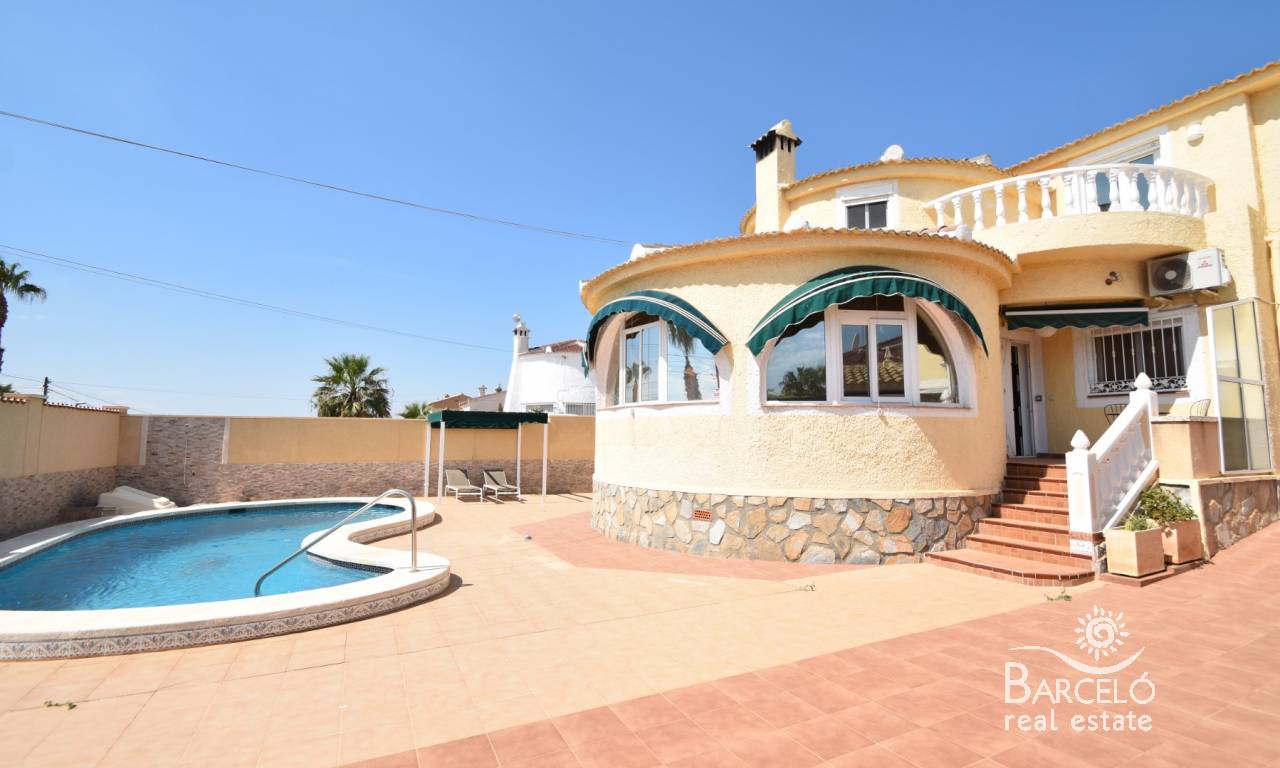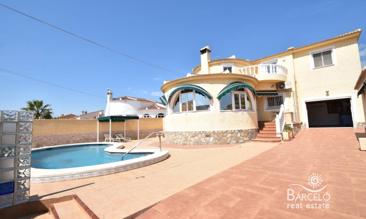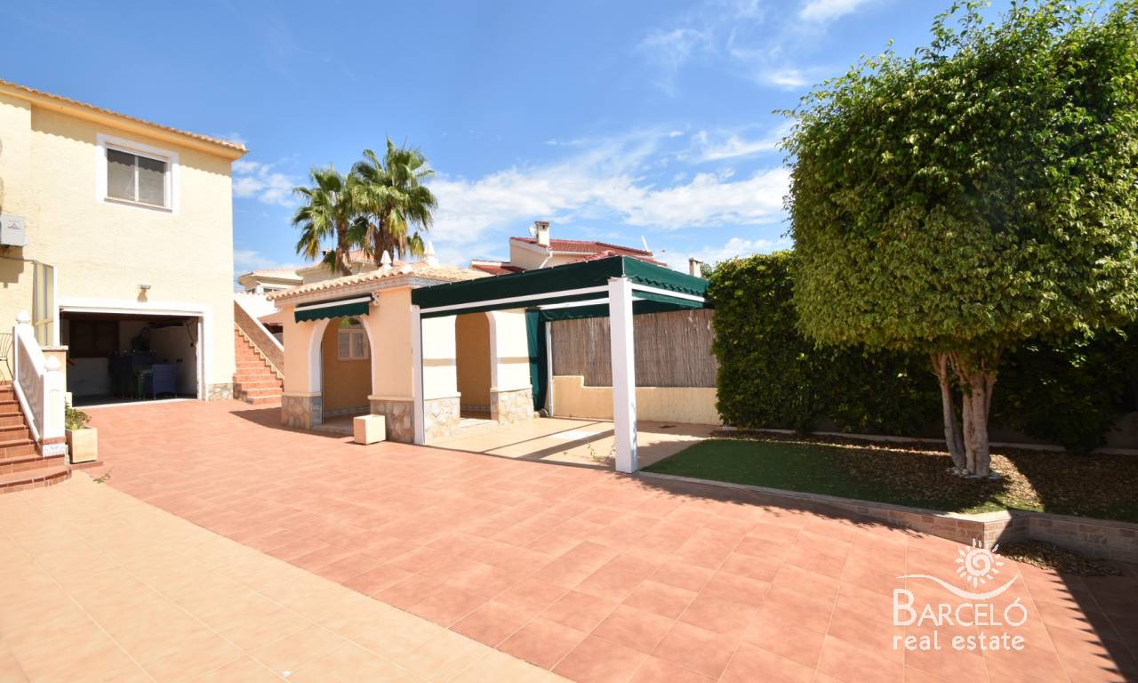La villa en sí está construida en dos niveles y consta de la casa principal en la planta baja y un anexo independiente arriba. Entrando a la casa principal tiene una pequeña terraza con puerta de entrada al salón, donde tiene una acogedora chimenea y aire acondicionado. Hay una terraza curva con vistas a la piscina y al jardín y ha sido acristalada con ventanas para crear un lugar fantástico para pasar los días de invierno y verano por igual. Desde el salón se accede a una cocina independiente con todos los electrodomésticos, y hay tres dormitorios dobles y un baño familiar grande y moderno.