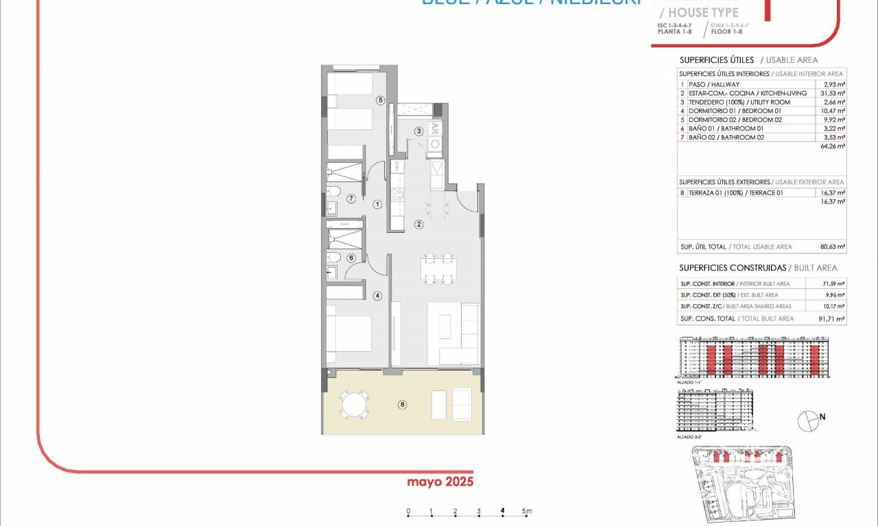 Los apartamentos están disponibles en configuraciones de 2 o 3 dormitorios con 2 baños, todos con cocina americana integrada en el salón, lo que maximiza la sensación de espacio y la luz natural. Las viviendas en planta baja cuentan con jardines privados, las plantas intermedias ofrecen amplias terrazas y los áticos cuentan con solárium para disfrutar del sol todo el año.