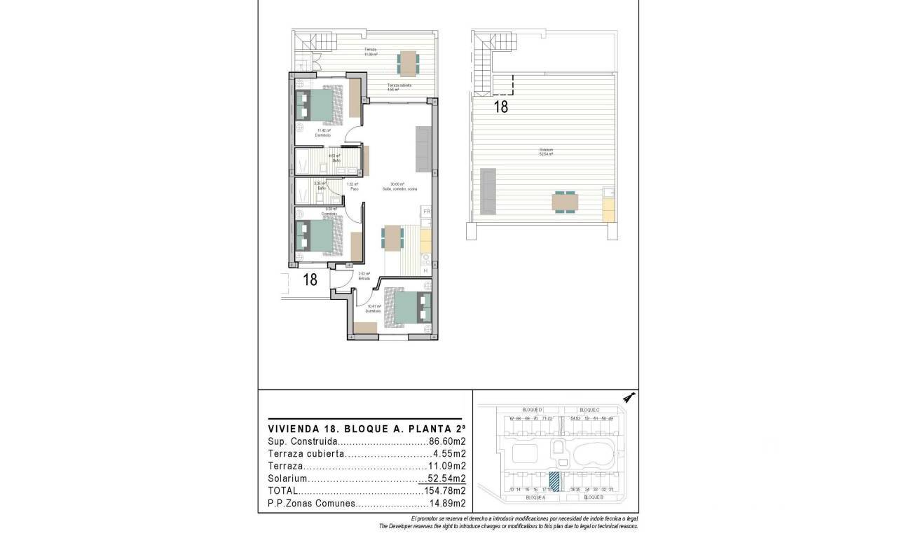 Modernos apartamentos de nueva construcción en San Cayetano, Torrepacheco, Murcia Vida contemporánea en un tranquilo entorno mediterráneo Este exclusivo complejo residencial de nueva construcción está situado en San Cayetano, Murcia, en el municipio de Torre Pacheco, a solo 9 km del mar y rodeado de varios campos de golf de renombre. El proyecto combina tranquilidad, comodidad y diseño contemporáneo, ofreciendo un entorno ideal para vivir de forma permanente, pasar las vacaciones o invertir en la Costa Cálida. La promoción consta de 72 apartamentos de 2 y 3 dormitorios y 2 baños, uno de ellos en suite, distribuidos en cuatro modernos edificios. También está prevista una segunda fase con bungalows y villas, lo que añadirá aún más valor y atractivo a la zona. Zonas comunes diseñadas para el relax y el bienestar Los residentes disfrutarán de espacios comunes cuidadosamente ajardinados que incluyen dos piscinas, hermosos jardines y un gimnasio totalmente equipado. Estas zonas crean un entorno agradable y social donde los vecinos pueden relajarse, hacer ejercicio y disfrutar del estilo de vida mediterráneo. El complejo residencial también cuenta con 40 kW de paneles solares fotovoltaicos que ayudan a sufragar los gastos de electricidad de la comunidad, contribuyendo a un entorno de vida más sostenible y eficiente desde el punto de vista energético. Apartamentos con espacios exteriores privados y solárium Cada apartamento está diseñado para aprovechar al máximo la vida al aire libre. Las propiedades de la planta baja incluyen jardines privados, los apartamentos de la primera planta ofrecen amplias terrazas y las viviendas de la última planta se benefician tanto de una terraza como de un solárium privado en la azotea. Todas las propiedades incluyen una cocina de verano en la terraza o el solárium, perfecta para disfrutar del sol durante todo el año. Todas las viviendas cuentan con una plaza de aparcamiento exterior y un trastero privado en el sótano, lo que añade comodidad y practicidad. Características de calidad e instalaciones energéticamente eficientes Estos apartamentos de nueva construcción se entregan con acabados de calidad e instalaciones modernas para garantizar el confort y la funcionalidad, incluyendo: Cocina totalmente equipada con electrodomésticos Baños totalmente equipados con muebles, espejos, iluminación y mamparas de ducha Preinstalación para aire acondicionado por conductos Sistema aerotérmico para agua caliente La combinación de materiales modernos y sistemas energéticamente eficientes hace que estas viviendas sean ideales para su uso durante todo el año. Excelente ubicación cerca de golf, playas y servicios San Cayetano es un pueblo tranquilo y bien comunicado, con servicios locales, tiendas y comercios. Su ubicación estratégica permite un fácil acceso a las playas, los campos de golf y las principales conexiones de transporte. Las distancias clave a los puntos de interés incluyen: Playas del Mar Menor 9 km Roda Golf 6 km Golf La Serena 14 km Los Alcázares 10 km Cartagena 30 km Aeropuerto de Murcia Corvera 25 km Aeropuerto de Alicante 90 km Asegure hoy mismo su propiedad en San Cayetano Este moderno complejo residencial ofrece una excelente oportunidad para disfrutar de la vida mediterránea en una zona tranquila y bien comunicada. Póngase en contacto con nosotros hoy mismo para obtener más información y reservar su apartamento de nueva construcción en San Cayetano.