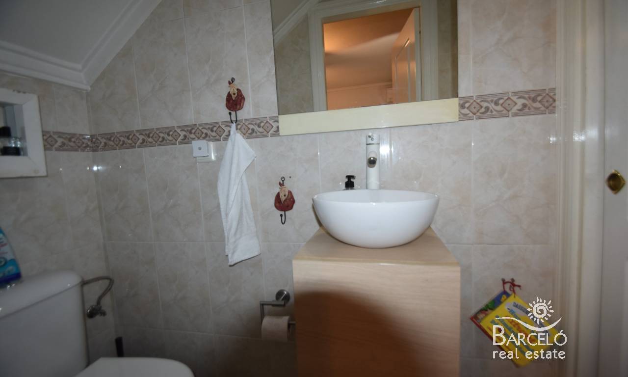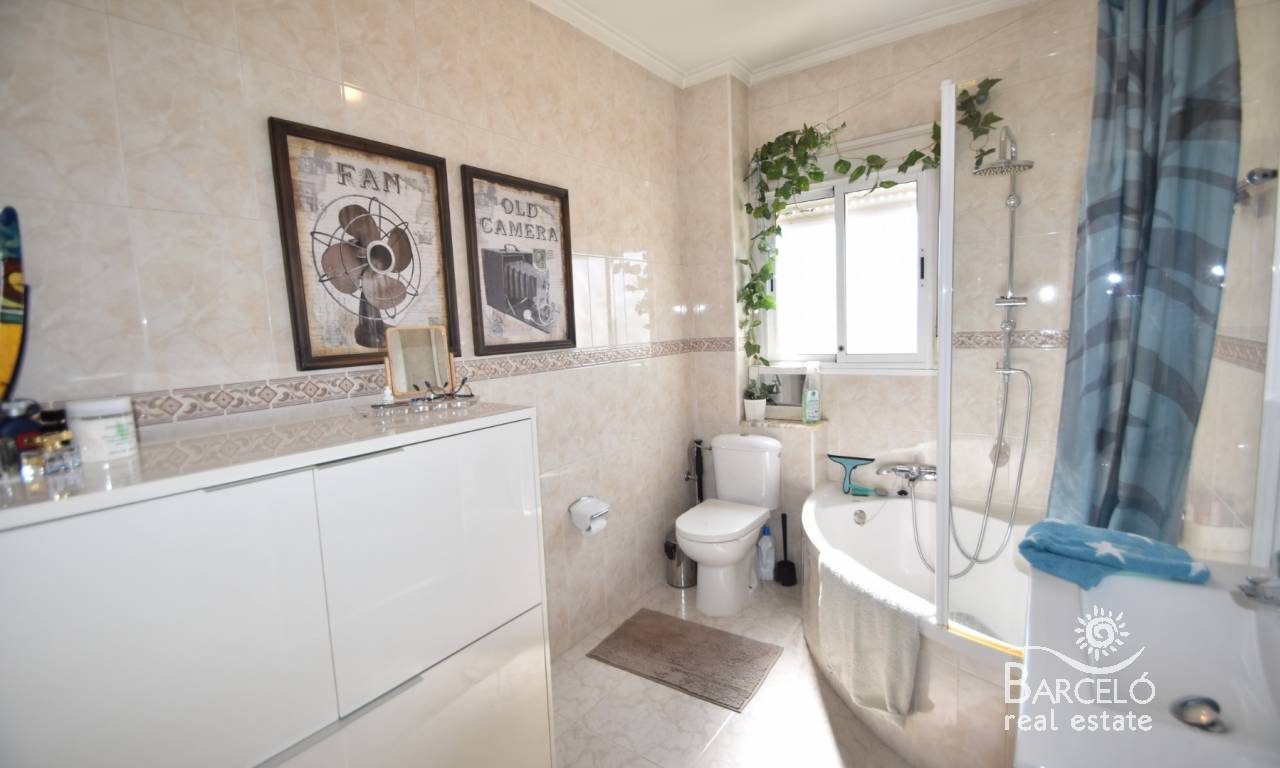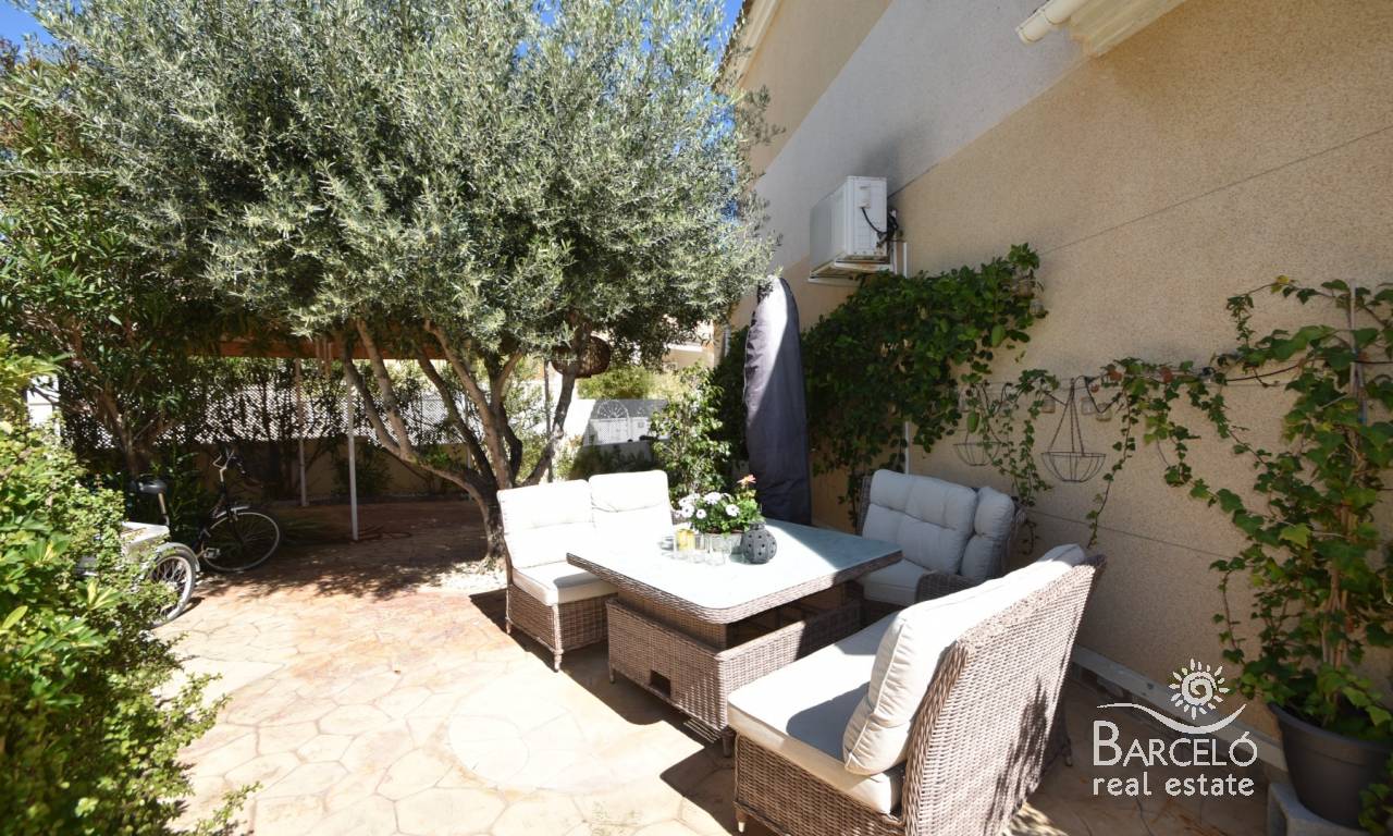 Al entrar en el jardín de la propiedad, encontrará su terraza, completamente embaldosada y con arbustos plantados para brindar privacidad y un hermoso entorno verde. Hay una amplia terraza frontal con una glorieta cubierta para dar sombra, y bordeando la villa se encuentra otra terraza trasera que da acceso a la cocina. Desde el jardín delantero, una terraza elevada cubierta es perfecta para disfrutar de las cálidas noches españolas. Además, dispone de aparcamiento privado en su parcela con una cochera sombreada.