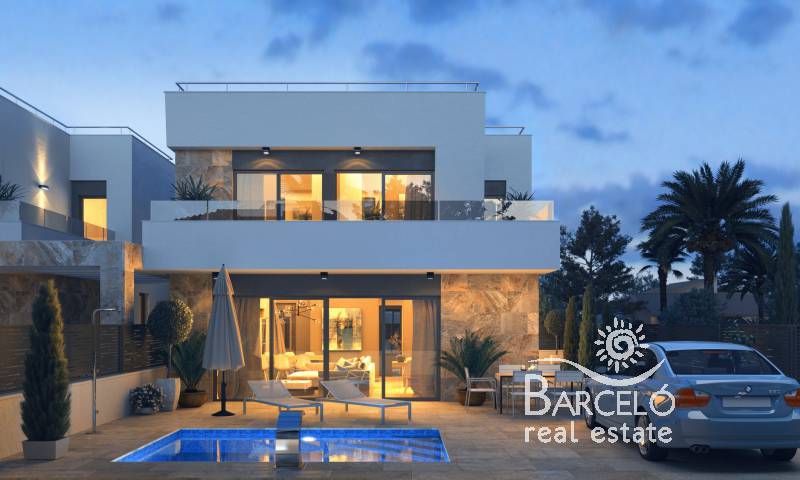 Estas villas de alta calidad con diseños modernos cuentan con parcelas desde 170m2 hasta 355m2. La superficie construida de la vivienda es de 155m2 y en el interior dispone de un amplio salón-comedor, cocina, solárium de 104m2, 3 dormitorios con posibilidad de un cuarto dormitorio y 2 baños.