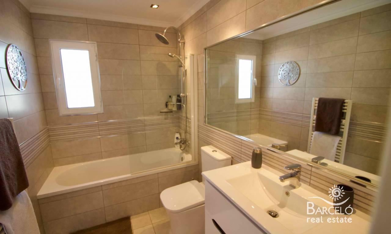 À l'intérieur, vous trouverez : une magnifique terrasse vitrée donnant un accès direct à la piscine et au jardin, actuellement aménagée en salle à manger ; un salon spacieux et accueillant avec cheminée et triple vitrage ; une cuisine semi-ouverte bien proportionnée avec bar ; deux chambres d'amis doubles avec placards intégrés ; une salle de bains familiale moderne avec baignoire ; et une impressionnante suite parentale plus grande que la moyenne avec placards intégrés et de nombreux rangements, comprenant également une salle de douche attenante et une porte extérieure.
