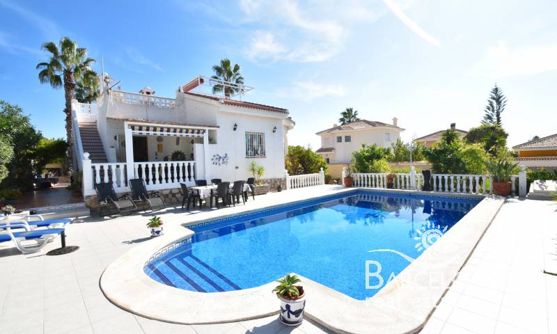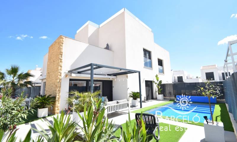Il y a une terrasse devant et derrière avec beaucoup d'espace pour se divertir et se détendre dans une atmosphère privée. Il y a aussi une salle de rangement extérieure dans la cour arrière. Dans le jardin de devant, vous avez un joli bar et une cuisine d'été avec votre propre piscine privée !