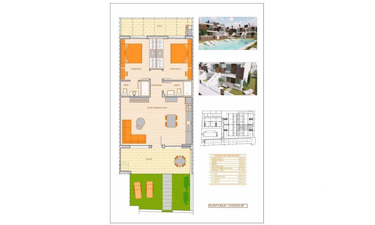 NOUVELLE CONSTRUCTION RÉSIDENTIELLE D'APPARTEMENTS DE PLAIN-PIED À PILAR DE LA HORADADA Nouvelle construction d'un complexe résidentiel exclusif composé de 22 appartements de plain-pied de qualité supérieure avec des finitions PORCELANOSA à Pilar de la Horadada. Des bungalows modernes de 2 chambres, 2 salles de bains, cuisine ouverte sur le salon, armoires encastrées. Les maisons du rez-de-chaussée disposent d'un grand jardin en gazon artificiel et au dernier étage, vous pourrez profiter du soleil toute l'année sur la terrasse et le solarium, ainsi que de la zone commune avec piscine et d'une place de parking pratique. Pilar de la Horadada est un village espagnol typique situé dans la partie la plus méridionale de la Costa Blanca. La grande rue principale abrite des supermarchés, de nombreux magasins, des restaurants et des bars, ainsi que de jolies places. Les belles plages de Torre de la Horadada et de Mil Palmeras, avec leur promenade de sable fin, ne sont qu'à 5 minutes. Les aéroports de Corvera (Murcia) et d'Alicante sont respectivement à 40 et 55 minutes.