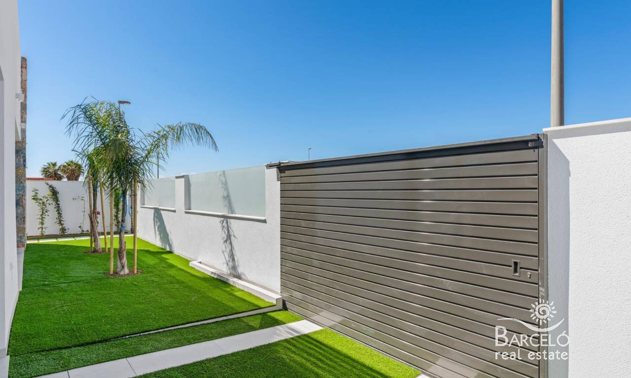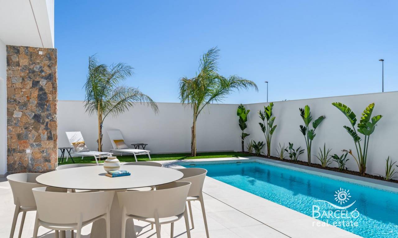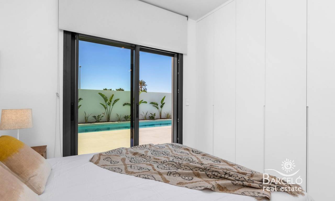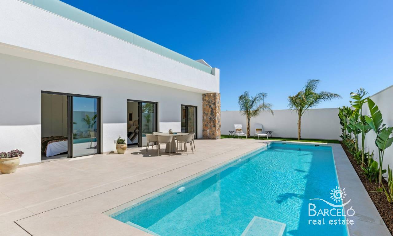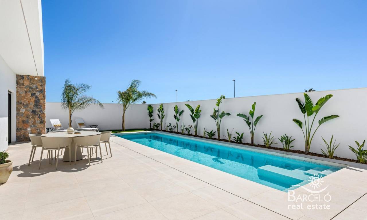 Nieuwbouwwoningen nabij Serena Golf in Los Alcázares Moderne villa's op een toplocatie aan de kust en bij een golfbaan Dit exclusieve nieuwbouwproject biedt moderne villa's in Los Alcázares, op korte afstand van de prestigieuze Serena Golf en op slechts 1,2 km van de zandstranden van de Mar Menor. Deze woningen, gelegen in een van de aantrekkelijkste gebieden van de regio Murcia, combineren een eigentijds ontwerp, comfort en een uitstekende locatie dicht bij de zee, golf en alle dagelijkse voorzieningen. Los Alcazares is een gevestigde kustplaats die bekend staat om zijn ontspannen levensstijl, lange boulevard, watersporten en het milde klimaat het hele jaar door. Ontwerp met één verdieping en privé buitenruimtes Het project bestaat uit stijlvolle villa's met 3 slaapkamers en 2 badkamers, beschikbaar in twee verschillende bouwoppervlakten van ongeveer 106 m² en 130 m². Het grotere model heeft ook een extra gastentoilet. Alle villa's zijn ontworpen op één verdieping, wat praktisch en comfortabel wonen mogelijk maakt. De open keuken, eetkamer en woonkamer komen direct uit op een terras en een privétuin met zwembad, waardoor een ideale ruimte ontstaat voor binnen- en buitenleven. Elke woning beschikt ook over een privé-solarium en een parkeerplaats op het perceel. Hoogwaardige afwerking en moderne uitrusting Deze villa's zijn gebouwd met hoogwaardige materialen en voorzien van moderne voorzieningen. De volledig ingerichte keukens zijn verkrijgbaar in wit glanzend of hout en zijn voorzien van kwartswerkbladen, roestvrijstalen spoelbak, inductiekookplaat met geïntegreerde afzuigkap, oven, magnetron, wasmachine, geïntegreerde koelkast en vaatwasser. De badkamers zijn voorzien van meubilair, spiegels, verlichting en elektrische handdoekverwarmers. Extra voorzieningen zijn onder meer elektrische jaloezieën in de slaapkamers, ledverlichting in het hele pand en een compleet airconditioningsysteem van Fujitsu. Privézwembad en energiezuinig comfort Elke villa heeft een privézwembad met blauwe keramische tegels, geïntegreerde traptreden en witte ledverlichting. Het zwembad is voorbereid voor de installatie van een warmtepomp. De combinatie van efficiënte klimaatbeheersing, moderne constructie en doordacht ontwerp zorgt het hele jaar door voor comfort. Uitstekende verbindingen en belangrijke afstanden De villa's liggen op loopafstand van het centrum van Los Alcazares en zeer dicht bij Serena Golf. Het strand ligt op ongeveer 1,2 km afstand. De stad Cartagena ligt op ongeveer 20 km afstand en biedt een rijk cultureel en gastronomisch aanbod. De internationale luchthaven Murcia Corvera ligt op ongeveer 22 km afstand en de luchthaven van Alicante op ongeveer 90 km. Er zijn ook verschillende golfbanen en jachthavens in de buurt, waardoor deze locatie ideaal is voor zowel permanent wonen als vakanties. Uw ideale huis aan zee en golf Als u op zoek bent naar een moderne nieuwbouwwoning in de buurt van het strand en de golfbaan in Los Alcazares, neem dan vandaag nog contact met ons op voor meer informatie of om een privébezichtiging te regelen.