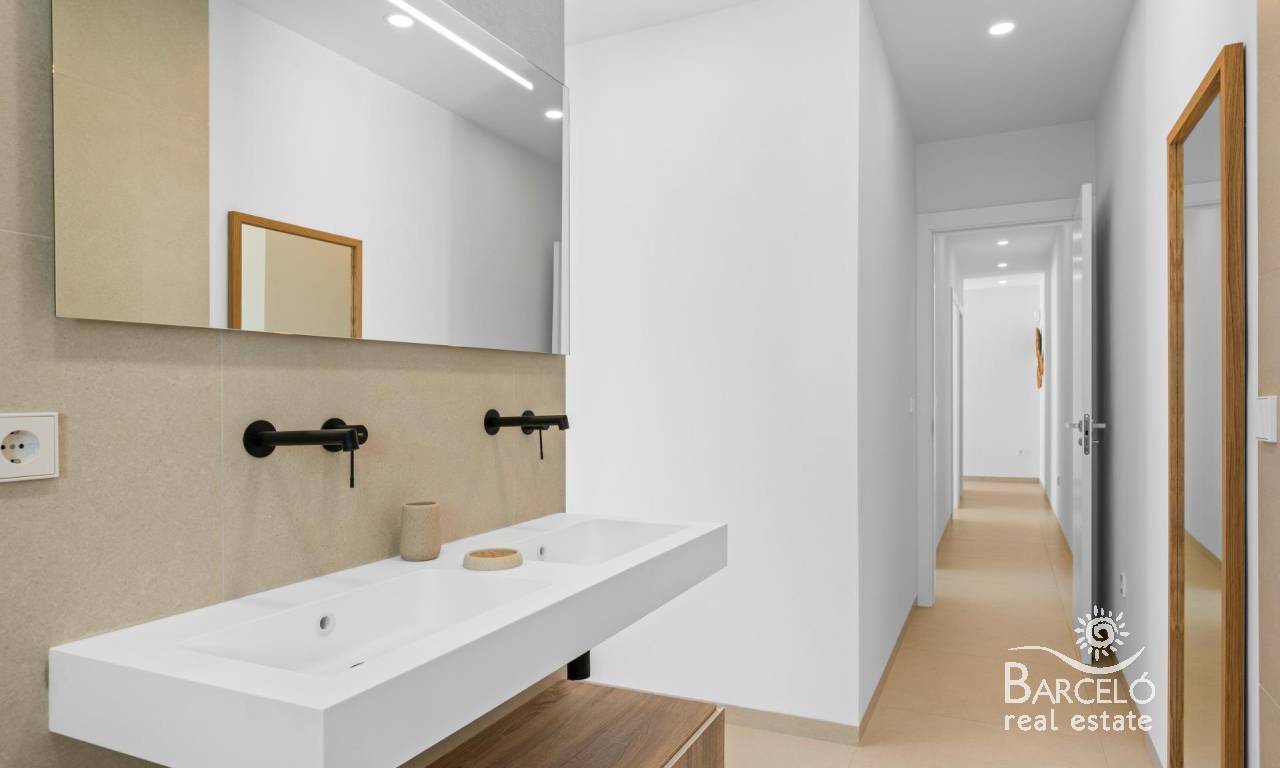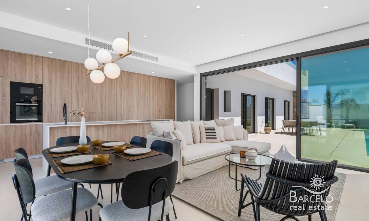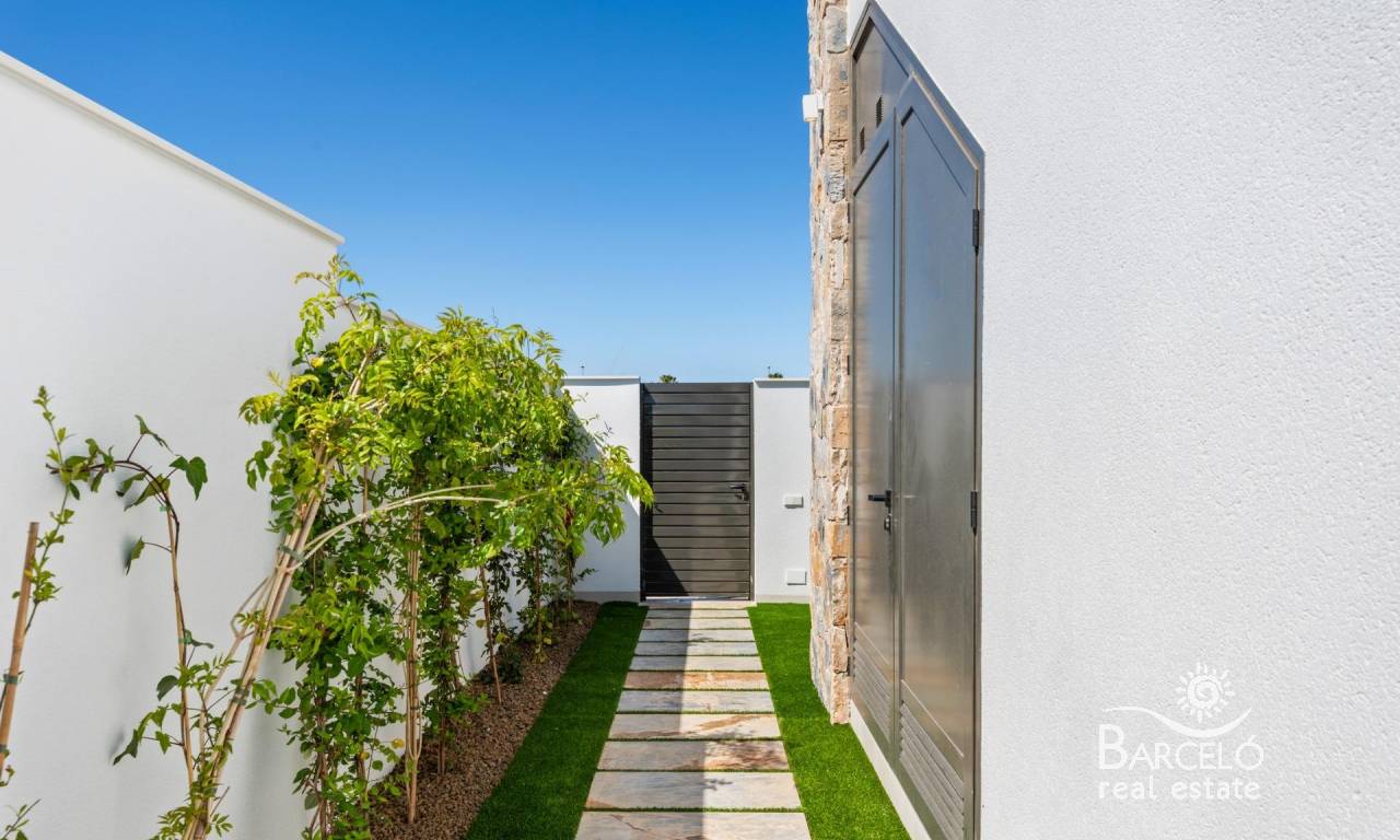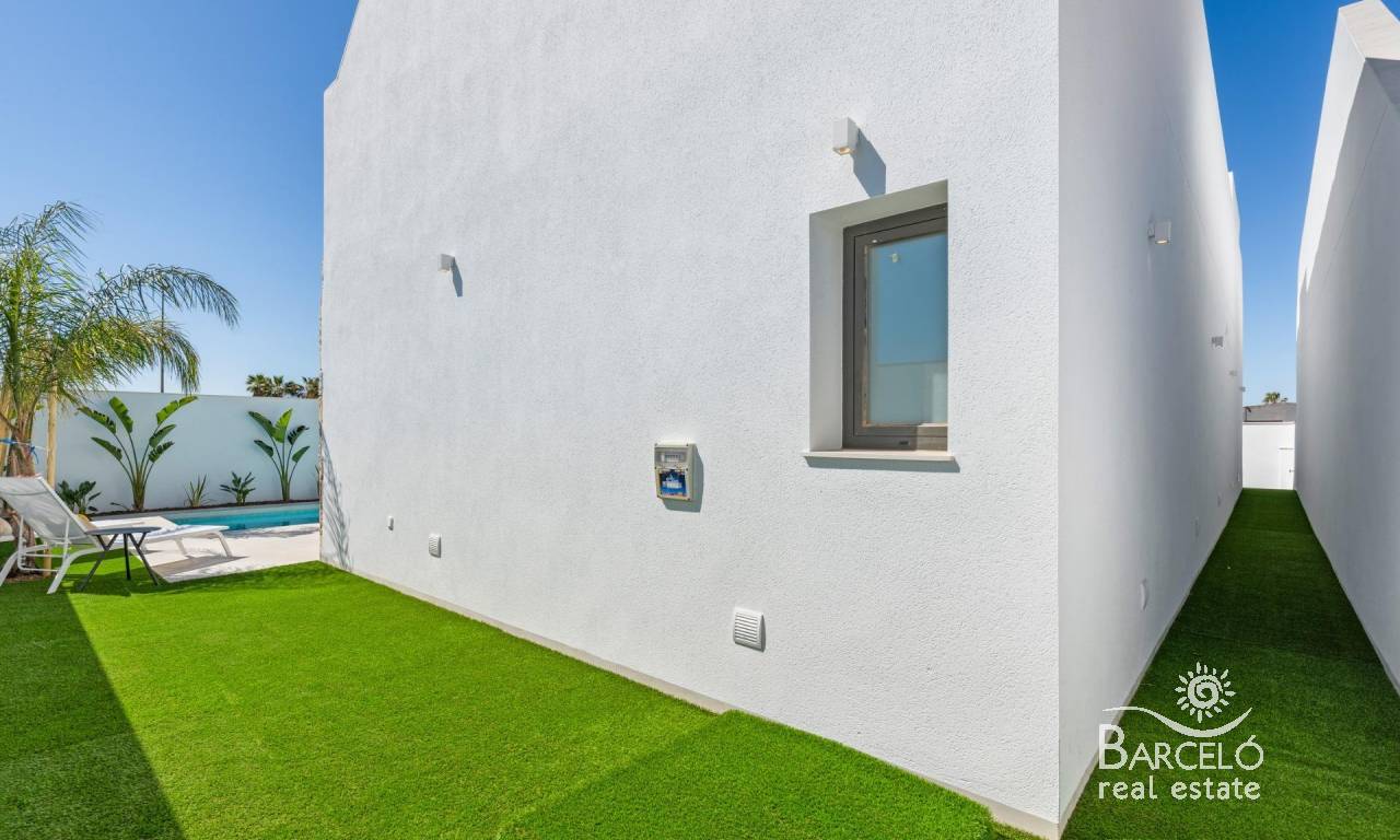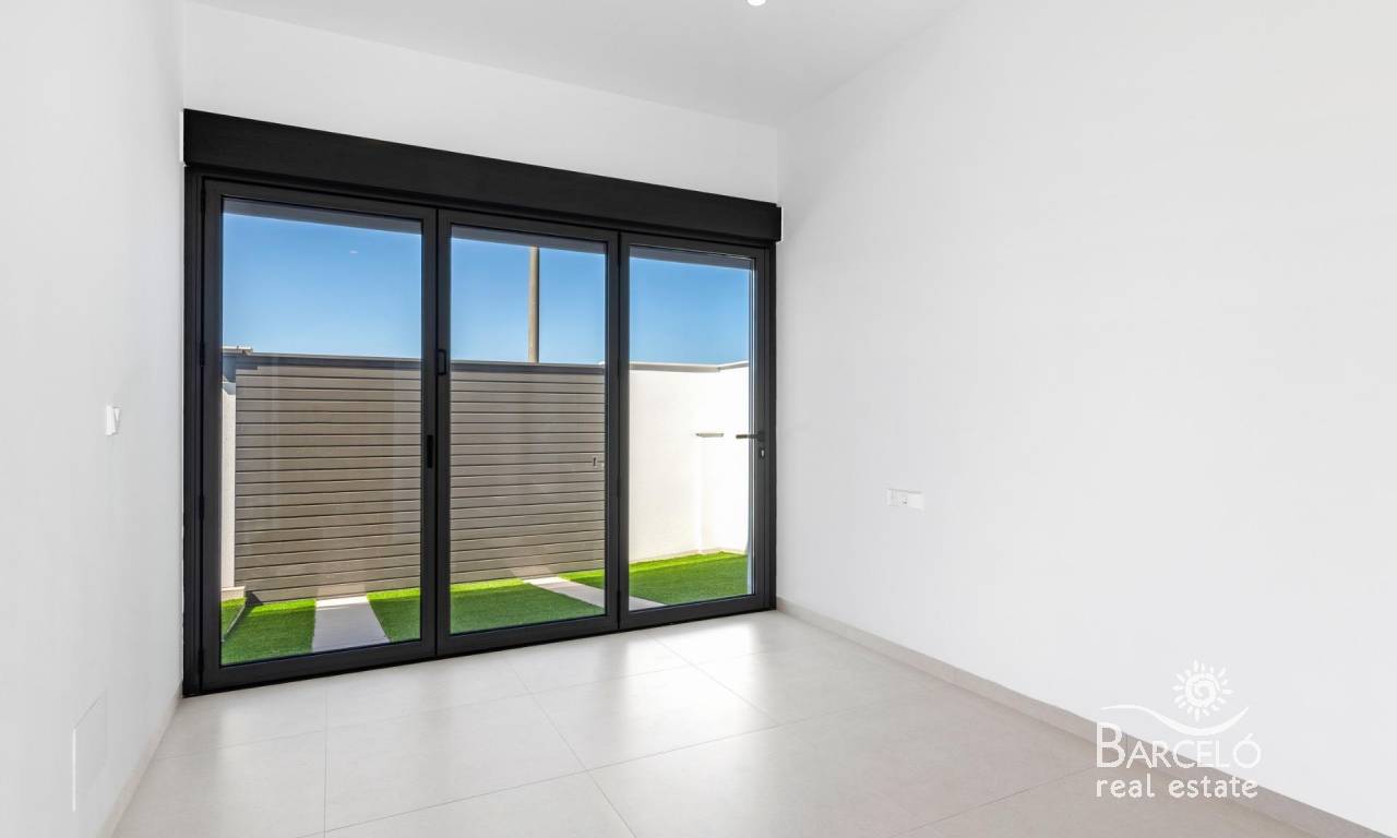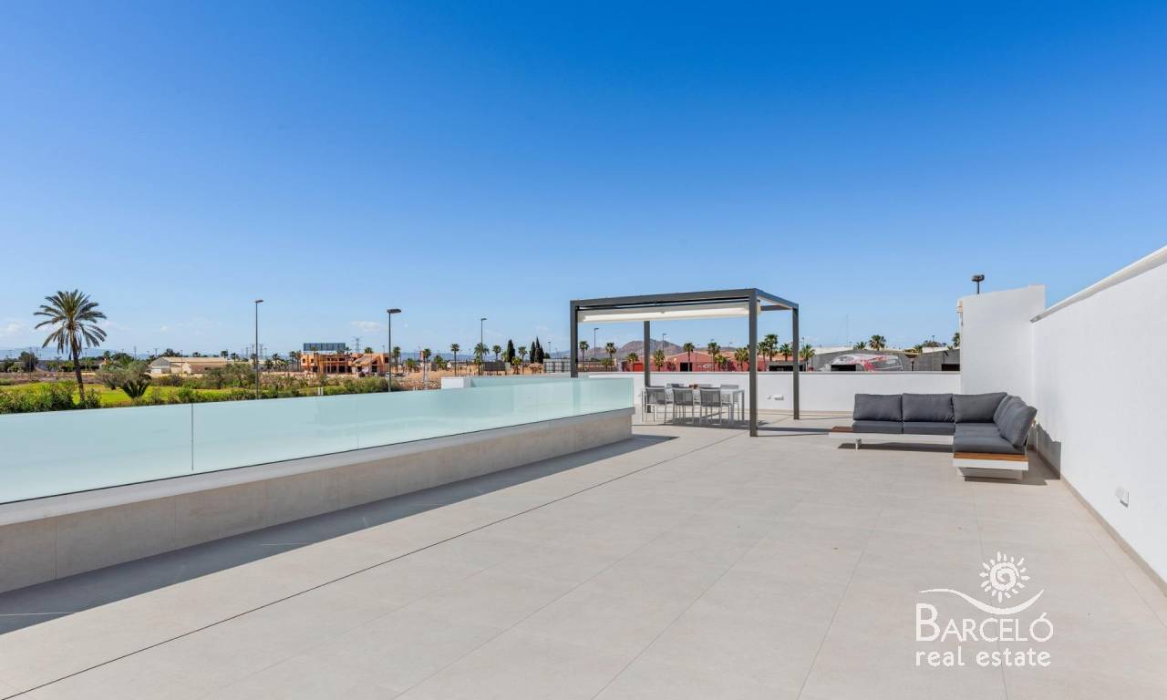 Nieuwbouwwoningen nabij Serena Golf in Los Alcázares Moderne villa's op een toplocatie aan de kust en bij een golfbaan Dit exclusieve nieuwbouwproject biedt moderne villa's in Los Alcázares, op korte afstand van de prestigieuze Serena Golf en op slechts 1,2 km van de zandstranden van de Mar Menor. Deze woningen, gelegen in een van de aantrekkelijkste gebieden van de regio Murcia, combineren een eigentijds ontwerp, comfort en een uitstekende locatie dicht bij de zee, golf en alle dagelijkse voorzieningen. Los Alcazares is een gevestigde kustplaats die bekend staat om zijn ontspannen levensstijl, lange boulevard, watersporten en het milde klimaat het hele jaar door. Ontwerp met één verdieping en privé buitenruimtes Het project bestaat uit stijlvolle villa's met 3 slaapkamers en 2 badkamers, beschikbaar in twee verschillende bouwoppervlakten van ongeveer 106 m² en 130 m². Het grotere model heeft ook een extra gastentoilet. Alle villa's zijn ontworpen op één verdieping, wat praktisch en comfortabel wonen mogelijk maakt. De open keuken, eetkamer en woonkamer komen direct uit op een terras en een privétuin met zwembad, waardoor een ideale ruimte ontstaat voor binnen- en buitenleven. Elke woning beschikt ook over een privé-solarium en een parkeerplaats op het perceel. Hoogwaardige afwerking en moderne uitrusting Deze villa's zijn gebouwd met hoogwaardige materialen en voorzien van moderne voorzieningen. De volledig ingerichte keukens zijn verkrijgbaar in wit glanzend of hout en zijn voorzien van kwartswerkbladen, roestvrijstalen spoelbak, inductiekookplaat met geïntegreerde afzuigkap, oven, magnetron, wasmachine, geïntegreerde koelkast en vaatwasser. De badkamers zijn voorzien van meubilair, spiegels, verlichting en elektrische handdoekverwarmers. Extra voorzieningen zijn onder meer elektrische jaloezieën in de slaapkamers, ledverlichting in het hele pand en een compleet airconditioningsysteem van Fujitsu. Privézwembad en energiezuinig comfort Elke villa heeft een privézwembad met blauwe keramische tegels, geïntegreerde traptreden en witte ledverlichting. Het zwembad is voorbereid voor de installatie van een warmtepomp. De combinatie van efficiënte klimaatbeheersing, moderne constructie en doordacht ontwerp zorgt het hele jaar door voor comfort. Uitstekende verbindingen en belangrijke afstanden De villa's liggen op loopafstand van het centrum van Los Alcazares en zeer dicht bij Serena Golf. Het strand ligt op ongeveer 1,2 km afstand. De stad Cartagena ligt op ongeveer 20 km afstand en biedt een rijk cultureel en gastronomisch aanbod. De internationale luchthaven Murcia Corvera ligt op ongeveer 22 km afstand en de luchthaven van Alicante op ongeveer 90 km. Er zijn ook verschillende golfbanen en jachthavens in de buurt, waardoor deze locatie ideaal is voor zowel permanent wonen als vakanties. Uw ideale huis aan zee en golf Als u op zoek bent naar een moderne nieuwbouwwoning in de buurt van het strand en de golfbaan in Los Alcazares, neem dan vandaag nog contact met ons op voor meer informatie of om een privébezichtiging te regelen.