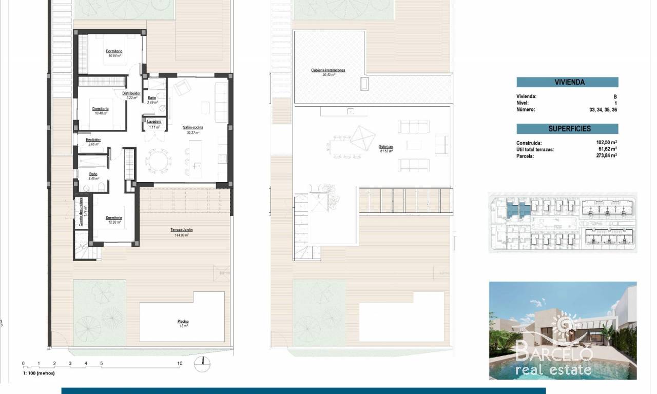 Eksklusive villaer og bungalower på Costa Cálida - design, komfort og en privilegert beliggenhet Et prosjekt som kombinerer privatliv og fellesskap Oppdag et nytt boligkonsept på Costa Cálida, designet for deg som søker den perfekte kombinasjonen av privatliv, komfort og sosialt liv. Dette eksklusive komplekset tilbyr frittliggende villaer og bungalower med tilgang til romslige fellesområder og et felles svømmebasseng, noe som gir det beste fra to verdener: roen i et privat hjem og komforten i fellesområder som kan nytes sammen med venner, familie og naboer. Alle boligene har parkeringsplass og bod i kjelleren, noe som garanterer sikkerhet og bekvemmelighet for beboerne. Moderne design og muligheter for personlig tilpasning Dette prosjektet tilbyr et bredt utvalg av boliger som passer til ulike behov og livsstiler: Bungalower i første etasje med private hager på opptil 122 m². Bungalower i toppetasjen med store terrasser og privat solarium. Eneboliger i én eller to etasjer, med tomter fra 201 til 356 m² og ulike planløsninger og etterbehandlingsalternativer. Alle boligene er designet for å maksimere det naturlige lyset og skape romslige og innbydende rom. Hovedsuiten er nøye utformet for å garantere privatliv og komfort, og soverommet er helt adskilt fra badet, slik at man unngår lys- og støyforstyrrelser i løpet av natten. Kvalitet og bærekraft i hver minste detalj Disse boligene er bygget med materialer av høy kvalitet og utstyrt med bærekraftig teknologi, som solcellepaneler og aerothermics, for å forbedre energieffektiviteten. Enestående funksjoner: Motoriserte persienner på soverommene. Pansret inngangsdør for økt sikkerhet. Forhåndsinstallasjon av kanalisert klimaanlegg. Moderne bad med skillevegger i herdet glass og hengende møbler med LED-speil. Strategisk beliggenhet i Los Alcázares Dette komplekset ligger bare noen få meter fra den prestisjetunge Serena golfbane og 1 km fra strendene ved Mar Menor, og har en privilegert beliggenhet i Los Alcázares, et av de mest lovende områdene på Costa Cálida. I tillegg gir den enkle tilgangen til motorveien AP-7 rask forbindelse til andre destinasjoner i regionen, og gjør det lettere å få tilgang til viktige tjenester som supermarkeder, sportssentre, skoler og apotek. Avstander til severdigheter La Serena Golf - 1 km (2 minutter med bil). Mar Menor-stranden - 1 km (2 minutter med bil eller 10 minutters gange). Murcia lufthavn - 35 km (30 minutter med bil). Cartagena havn - 22 km (20 minutter med bil). Lokalt kjøpesenter - 3 km (5 minutter med bil). En middelhavsstil med høy lønnsomhet Dette prosjektet representerer ikke bare et utmerket alternativ for å nyte middelhavsstilen, men det er også en trygg investering i et område i vekst. Ikke gå glipp av denne unike muligheten. Kontakt oss i dag for mer informasjon og for å reservere ditt ideelle hjem på Costa Cálida.