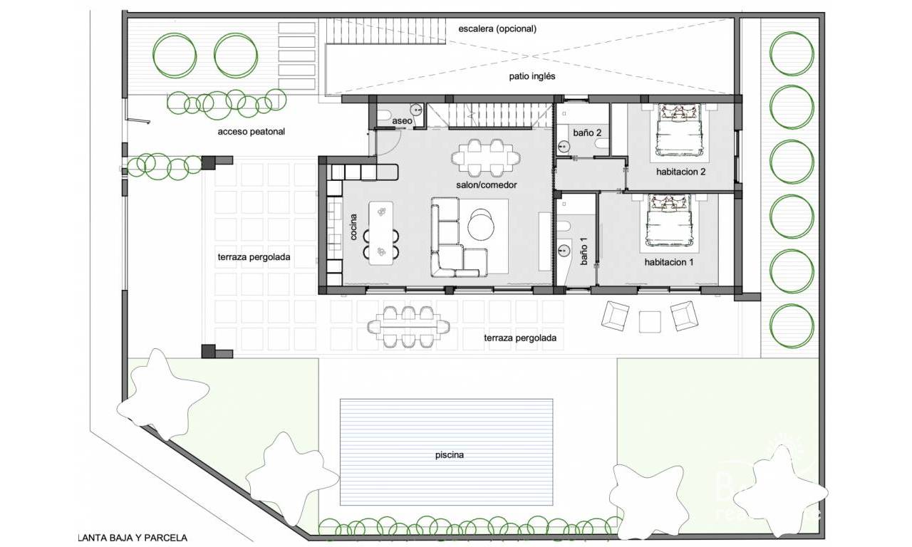 Når du kommer inn i villaen i første etasje, fanger de doble takhøydene i stuen umiddelbart øyet. Glassvinduer og -dører gir rikelig med lys og skaper en følelse av luksus og rom. I denne etasjen er det moderne kjøkken, gjestetoalett og to romslige soverom med hvert sitt bad. I første etasje ligger den vakre mastersuiten med soverom, garderobe, kontor og bad. Solterrassen med valgfri pergola tilbyr fantastisk utsikt over omgivelsene, innsjøene og havet.