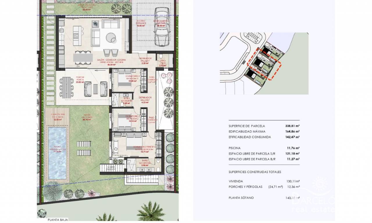 NYBYGDE VILLAER I PRIVAT INNGJERDET FERIESTED I PROVINSEN MURCIA Nybygde villaer i privat inngjerdet feriested i Murcia-regionen, omgitt av utmerkede golfbaner og bare 10 minutter fra sandstrendene i Mar Menor-havet. Villaer bygget over 2 etasjer og har 3 soverom, 2 bad og et gjestetoalett og er designet med en moderne stil og åpent konsept, bestående av et fullt utstyrt kjøkken og stue / spisestue, garderober, privat hage med basseng og parkeringsplass utenfor veien, privat solarium. Stor villa på 146 m² pluss en veldig nyttig kjeller på 120 m² ferdig med glatte vegger, vann og elektriske punkter. Dette gir den perfekte muligheten til å bruke som ekstra innkvartering, kontor, treningsstudio, kinorom, lekerom for barn.... Ligger i et privat inngjerdet feriested, med en hovedinngang og 24 timers sikkerhet. Anlegget er designet rundt et imponerende grøntområde på 126 000 m2. Det består av gang- og sykkelstier, idrettsanlegg, padle- og tennisbaner, en minigolfbane, hager, hundeparker, fritidsområder, klubbhus.... Også i det sentrale området er juvelen i feriestedet, en krystallklar kunstig innsjø på nesten 17.000m2 vannoverflate, omgitt av hvite sandstrender og palmer, og bringer et stykke Karibia til Murcia-regionen. Det er 2 øyer i innsjøen, en av dem har sin egen bar, det er også "strand Chiringuitos" spredt rundt innsjøen. Anlegget ligger strategisk plassert mindre enn 4 km fra stranden og byen Los Alcázares, hvor du kan utøve forskjellige vannsport, omgitt av flere golfbaner og byen Cartagena mindre enn 15 minutter med bil og 22 km fra Murcia flyplass, og har derfor et bredt kulturelt, gastronomisk og sportstilbud innen rekkevidde.
