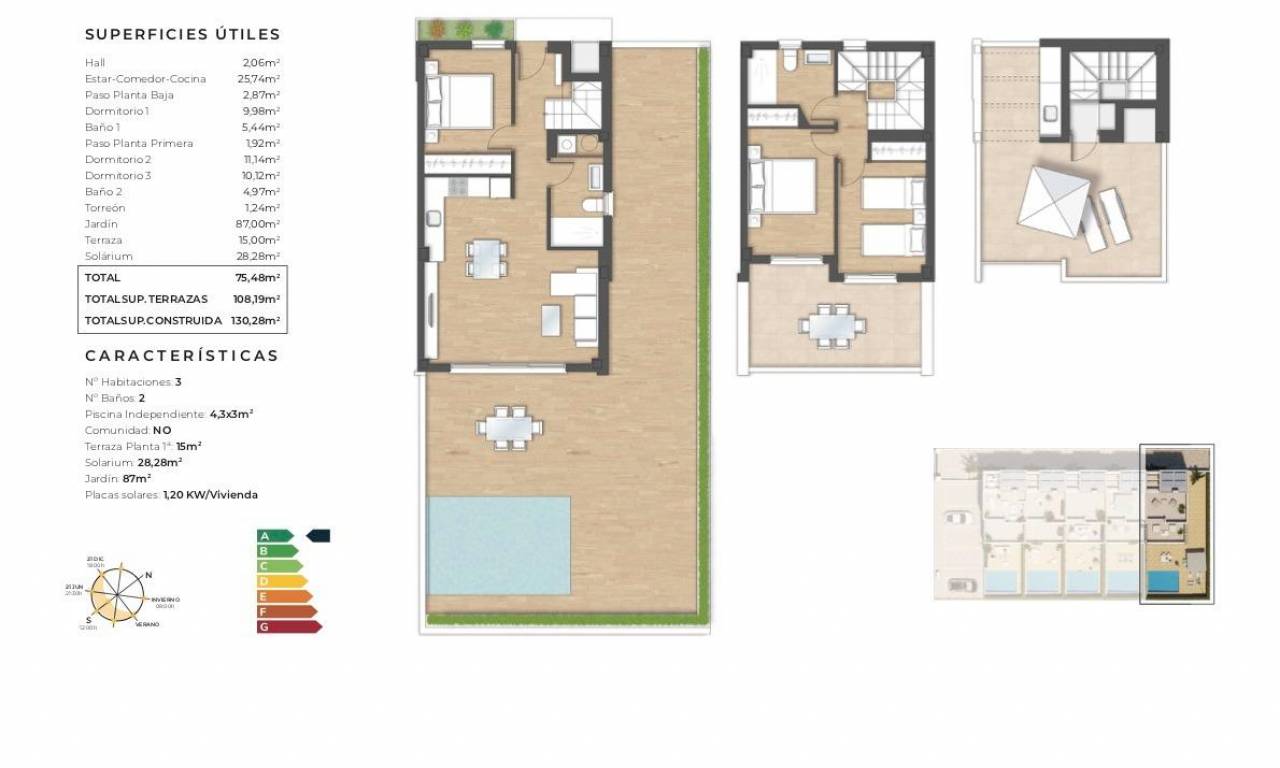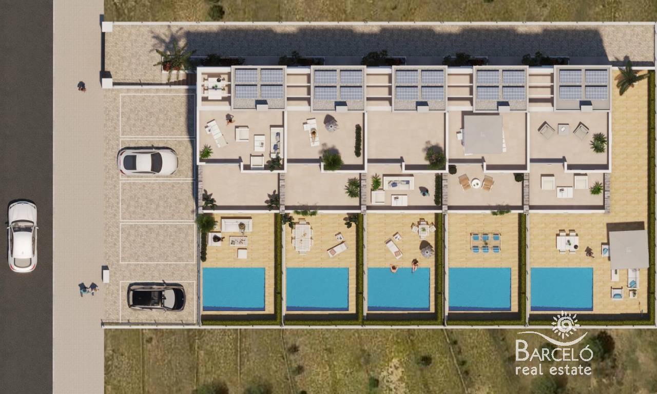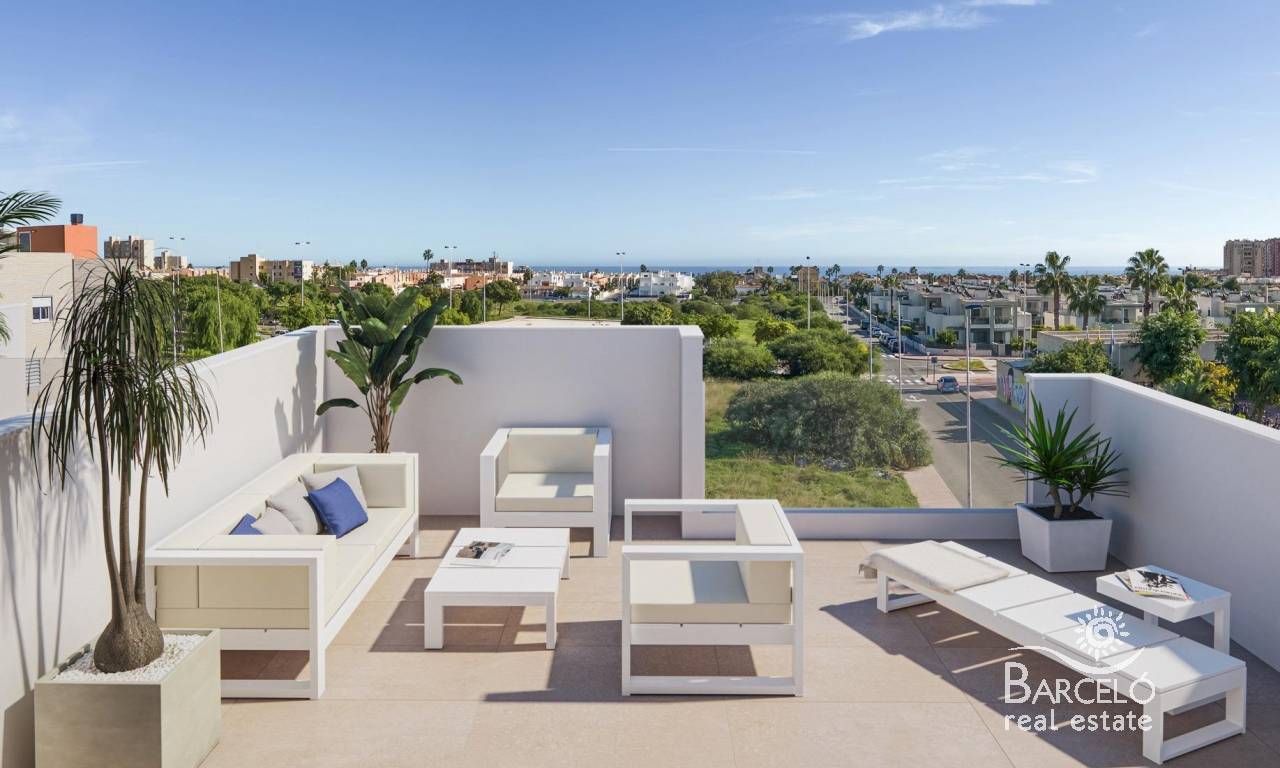 NYBYGD TOMANNSBOLIG I TORREVIEJA Nybygg bolig av 5 vakre eiendommer med private svømmebassenger i Torrevieja. Tomannsbolig har 3 soverom, 2 bad, åpen kjøkkenløsning med stue, garderober, terrasse, privat solarium med grillplass, hage med basseng og felles parkeringsplass. Eiendommer bygget med materialer og utførelser av topp kvalitet. Den utrolige beliggenheten 5 minutter fra sjøen og nærheten til de viktigste shopping- og fritidsområdene i Torrevieja, samt golfbanene, gjør det til et unikt og eksklusivt sted å bo. Torrevieja er en spansk by i provinsen Alicante, på Costa Blanca. Den er kjent for sitt typiske middelhavsklima og kystlinje. Den har strandpromenader med feriesteder langs sandstrendene. Det lille hav- og saltmuseet har utstillinger om byens fiske- og salthistorie. I innlandet har naturparken Lagunas de La Mata-Torrevieja stier og to salte laguner, en rosa og en grønn. Alicante flyplass ligger 40 minutter unna og Murcia flyplass ca. 1 time unna.
