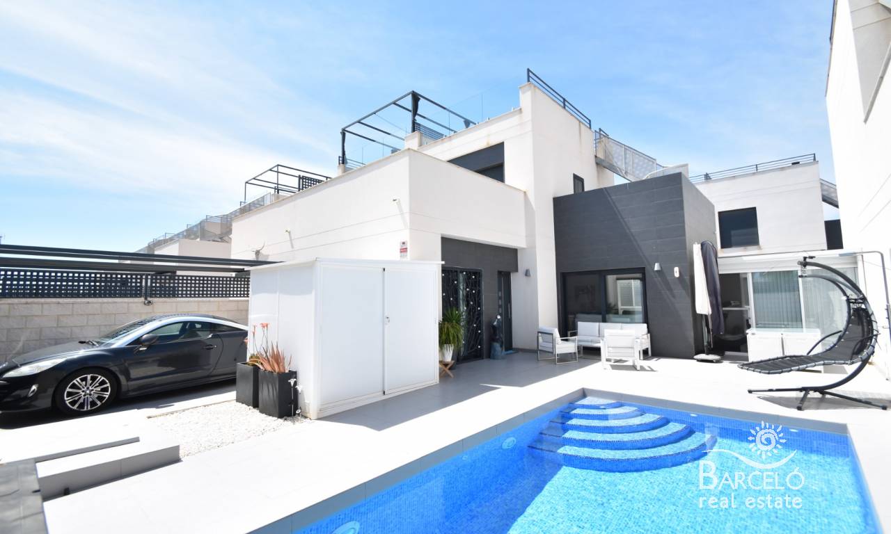 If you are looking for a property for sale in Pueblo Bravo Quesada, visit the interesting selection of properties in Pueblo Bravo that BARCELO offers you. You will be amazed by our spectacular new construction or resale chalets built with a modern design characterized by straight lines and wide glass facades. The houses are very bright and sunny . They are located on a plot with a private pool surrounded by a solarium. The excellent climate of the Costa Blanca South will allow you to enjoy, whenever you wish, a pleasant reading of a book while you sunbathe.