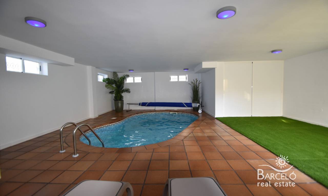 The property sits on a generous corner plot right next to the community swimming pool, and is south-west facing and has sun all afternoon. Outside on the fully tiled plot you will find private off road parking, paved areas for seating and entertaining, and a side gate with direct access to the communal pool area. You also have stairs leading down to the basement area (also accessed from inside the house) where you have an amazing oasis with private heated swimming pool and relaxing areas – your very own summer and winter escape! There is also a full shower room and storage area in the underbuild.