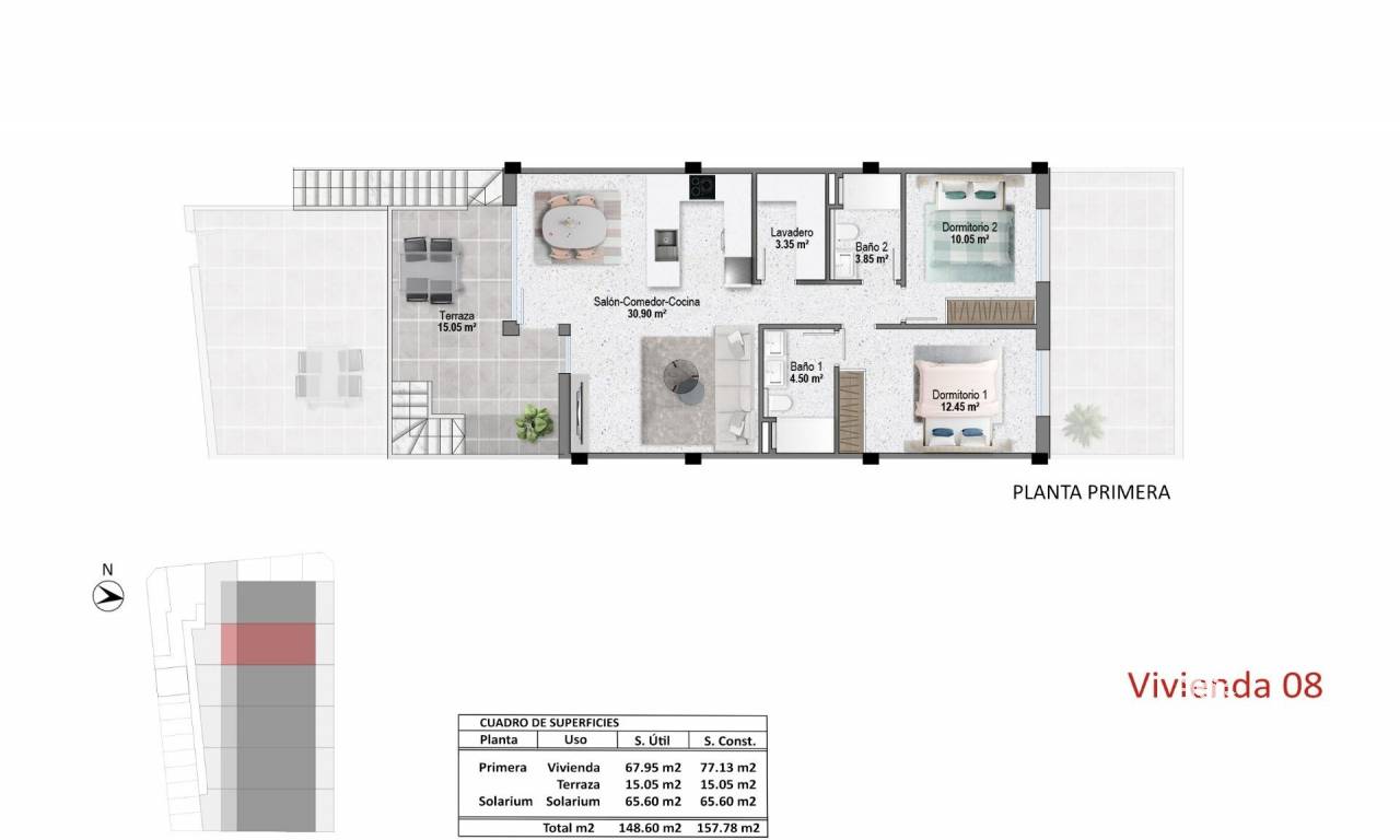 New Build Bungalows in Pilar de la Horadada Near the Beach and Town Centre Contemporary Living in the Heart of Costa Blanca Welcome to a boutique residential complex of 12 new build bungalows located in Pilar de la Horadada, a vibrant coastal town at the southern tip of the Costa Blanca. This prime location offers the perfect blend of tranquil Mediterranean living and convenience, with all essential services, shops, restaurants, and amenities within walking distance. The beautiful sandy beaches of Torre de la Horadada and Mil Palmeras are just 3 km away, ideal for relaxed beach days or water sports. Choice of Ground Floor or Top Floor Bungalows This exclusive development offers two types of modern homes to suit your lifestyle: Ground floor bungalows with 3 bedrooms, 2 bathrooms, and large private front and rear terraces with direct access to the communal pool and gardens. Top floor bungalows with 2 bedrooms, 2 bathrooms, and an expansive private rooftop solarium, complete with a summer kitchen, pergola, and guest toilet. All homes feature bright open-plan living areas, fully equipped kitchens, ducted air conditioning, and private parking. Bedrooms include built-in wardrobes and the bathrooms benefit from underfloor heating for added comfort. Premium Features for Modern Mediterranean Living The homes are designed with high-quality finishes and practical features, including: Armoured front door with aluminium finish Electric shutters in living room and bedrooms Aerothermal hot water system Kitchen appliances from BALAY or equivalent Rooftop solariums with artificial grass, outdoor shower, lighting, and full summer kitchen with dishwasher, small fridge, induction hob, and extractor. Strategic Location with Excellent Connectivity Pilar de la Horadada is well connected to major points of interest along the Costa Blanca and Costa Cálida: Beaches (Torre de la Horadada / Mil Palmeras) – 3 km Lo Romero Golf Course – 6 km Corvera Airport (Murcia) – 40 km Alicante Airport – 55 km Zenia Boulevard Shopping Centre – 14 km Marina of San Pedro del Pinatar – 11 km Your Ideal Home in the Sun Whether you’re looking for a holiday escape, a year-round residence, or a rental investment, these bungalows in Pilar de la Horadada offer excellent value and quality in one of the Costa Blanca’s most desirable towns. Contact us today to arrange a viewing or request more information!