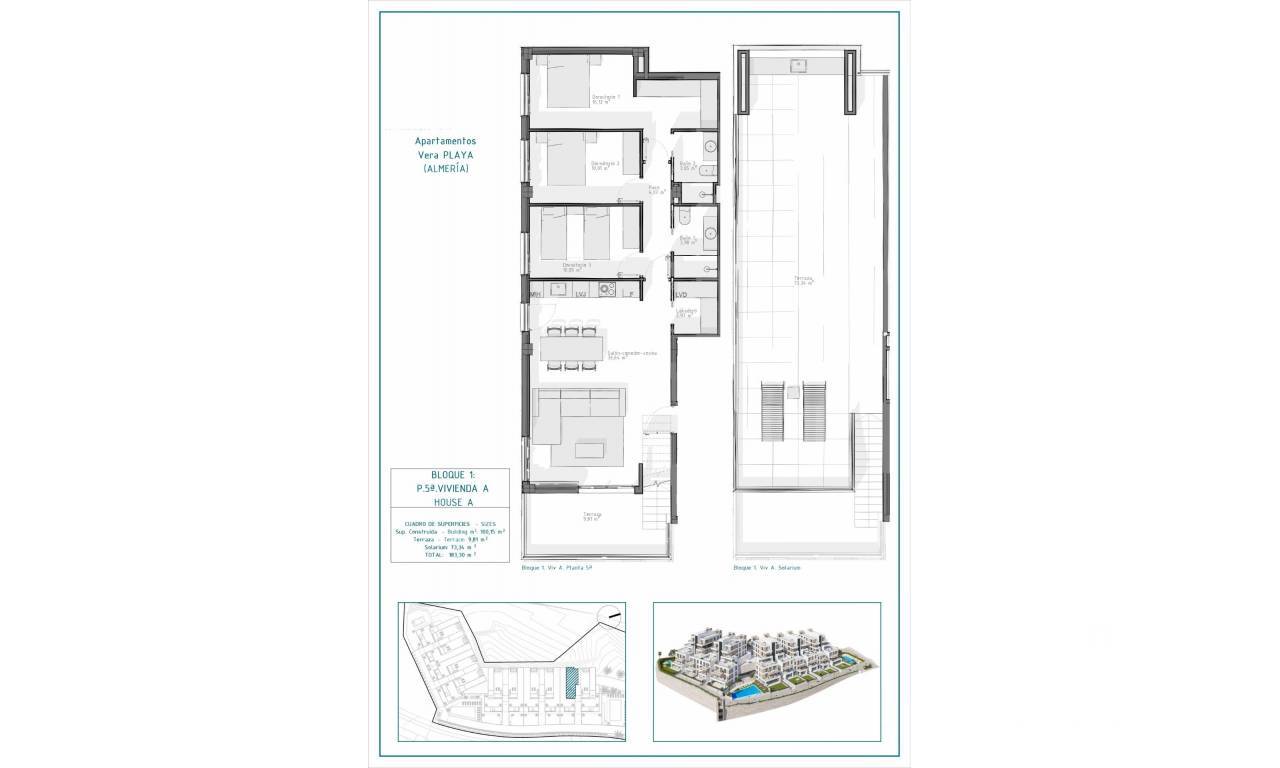 New Build Apartments in Vera Playa, Almería – Modern Homes Near the Sea Contemporary Living in Pueblo Salinas, Just 2 km from the Beach Introducing a stunning new residential development located in the sought-after area of Vera Playa, within the exclusive Pueblo Salinas urbanization. This modern complex offers a privileged lifestyle just 2 km from the beaches of Vera (Almería), boasting spectacular sea views and a peaceful Mediterranean environment ideal for year-round living or holiday enjoyment. Elegant Homes with Modern Comfort and Style This new development consists of 60 high-quality apartments distributed across 5 low-density blocks, with only two properties per floor. Choose between 2 or 3-bedroom layouts designed with functionality, comfort, and style in mind. Options include: Ground floors with private gardens Middle-floor units with spacious terraces Top-floor penthouses with large solariums including summer kitchen and pergola with solar panels. All properties feature: Open-plan fully equipped kitchens with integrated fridge, dishwasher, induction hob, oven, microwave, and extractor fan Bright living spaces and LED lighting throughout (except bedrooms) Motorized aluminum shutters in bedrooms Bathrooms with modern finishes, including towel heaters, shower trays with glass screens and built-in furniture Pre-installation of ducted air conditioning Aerothermal system for efficient hot water production Security entrance door Exceptional Community Amenities Residents will enjoy access to a wide range of amenities designed to enhance comfort and leisure, including: Two outdoor swimming pools perfect for the summer months One indoor heated pool for year-round use Private parking space and storage unit included with every property Pre-installation for electric vehicle charging at parking areas Prime Location with Excellent Connections Vera Playa is a popular coastal destination known for its wide sandy beaches and relaxed lifestyle. The development’s location provides easy access to essential services and attractions: Beach: 2 km Desert Springs Golf Resort: 8 km Vera town center: 5 km Garrucha marina and restaurants: 6 km Parque Comercial Mojácar: 10 km Almería Airport: 85 km (1 hour by car) Make Vera Playa Your New Home Whether you're looking for a permanent residence, a holiday retreat, or a smart investment, these new build apartments offer unmatched value in one of the most desirable areas of the Costa de Almería. Contact us today for more information and to schedule your visit.