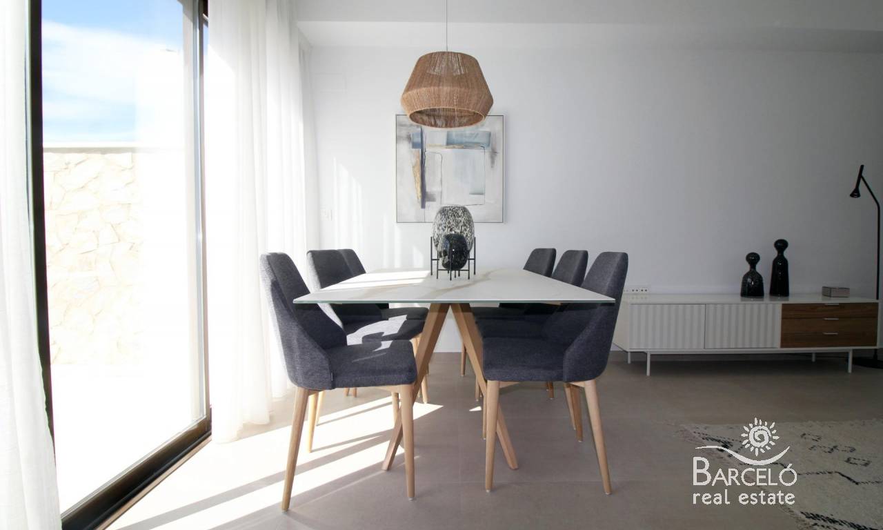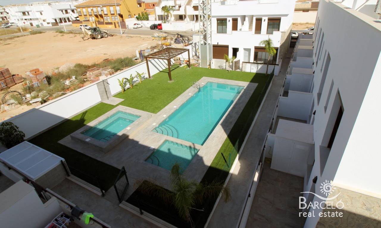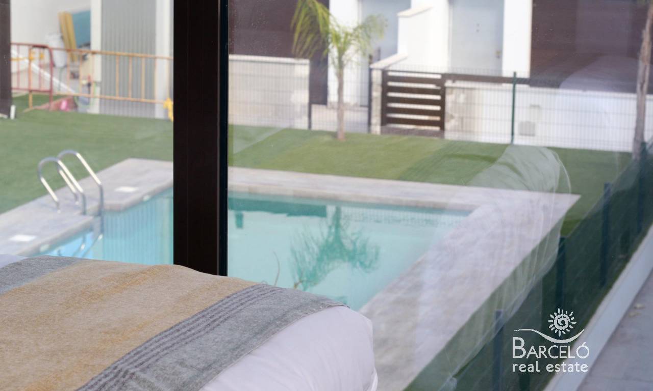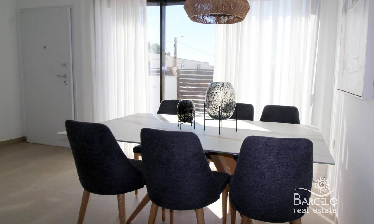 Modern Townhouses and Semi-Detached Homes in Pilar de la Horadada Discover this exclusive residential development featuring only six modern semi-detached and terraced homes in the tranquil town of Pilar de la Horadada, on the southern tip of the Costa Blanca. Designed with contemporary architecture and high-quality finishes, these new-build properties offer a perfect blend of comfort and style in a sought-after location. Spacious Three and Four Bedroom Layouts Each home boasts spacious living areas with an open-plan kitchen and living room designed to maximise natural light. Choose from three or four-bedroom floor plans, with two or three bathrooms depending on the model. Ground-floor layouts include two terraces: a front terrace with space for private parking and a rear terrace with direct access to the communal pool. The first floor features an additional terrace off the bedrooms, while upstairs a rooftop solarium provides panoramic views and an ideal space for outdoor entertaining. High-Quality Interior Finishes Interiors are appointed with premium materials, including smooth plaster walls, porcelain tile flooring throughout, and fitted wardrobes in each bedroom. The open kitchens come fully equipped with modern cabinetry. Additional comforts include pre-installation for ducted air conditioning and aerothermal systems for energy-efficient hot water. Community Amenities and Private Parking Residents enjoy a well-maintained communal pool, perfect for relaxation on sunny days. Each home includes a private on-plot parking space, ensuring security and convenience. Pilar de la Horadada: Traditional Charm on the Costa Blanca Pilar de la Horadada is a charming Spanish town known for its welcoming atmosphere and traditional architecture. The town centre is just a short walk away, where you will find supermarkets, local shops, restaurants, bars, and picturesque plazas. Enjoy a leisurely stroll along the main street, sampling authentic Mediterranean cuisine or exploring artisan boutiques. Proximity to Beaches and Airports Experience the best of coastal living with the fine sandy beaches of Torre de la Horadada and Mil Palmeras just a 5‑minute drive (approximately 2 km) from your new home. These beaches boast clear waters, golden sand, and a lively promenade lined with cafés and sea-view restaurants. For easy travel, Corvera Airport (Murcia) is approximately 40 km away (40 minutes by car), and Alicante Airport is around 55 km (55 minutes by car). Additionally, La Zenia Boulevard shopping centre is 15 km (15 minutes) from the development, offering a wide range of retail, dining, and entertainment options. Secure Your New Home Today Don’t miss this opportunity to own a brand-new semi-detached or terraced home in Pilar de la Horadada. Combining modern design, top-quality finishes, and a prime location near beaches, shops, and services, these properties are ideal as a permanent residence, holiday home, or investment. Contact us now for more information and to arrange a visit.