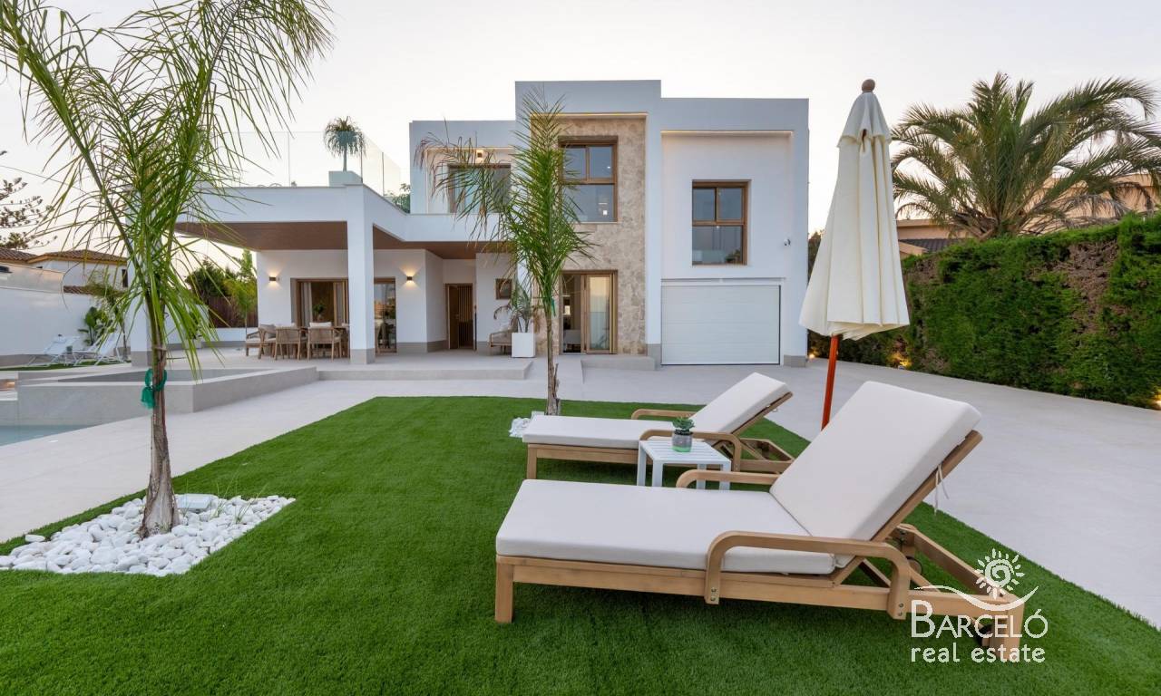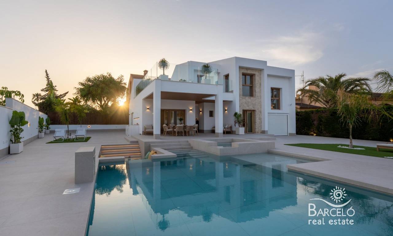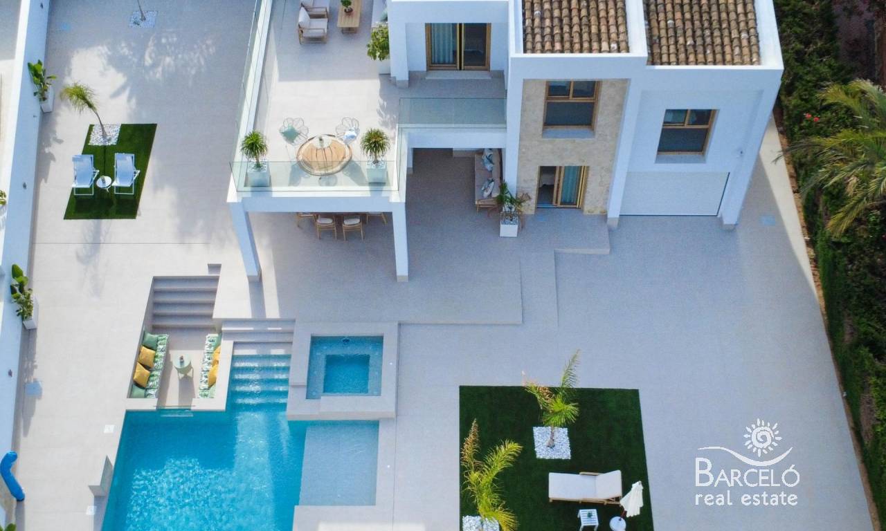 The villa includes two porches, a 47 m² private pool with jacuzzi and beach area, as well as a solarium on the upper floor. The chill-out area, set with LED lighting, creates the perfect environment for relaxation. The outdoor kitchen makes this villa the ideal place to enjoy the Mediterranean climate with family and friends.