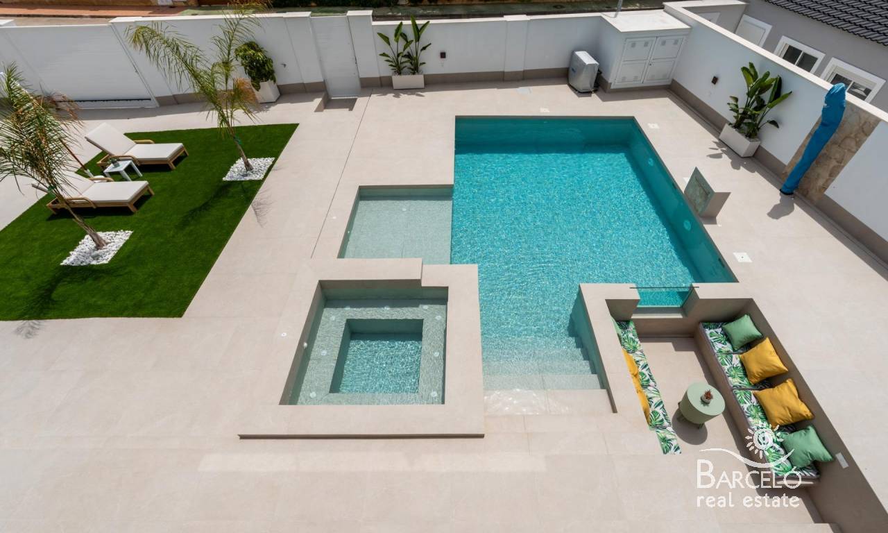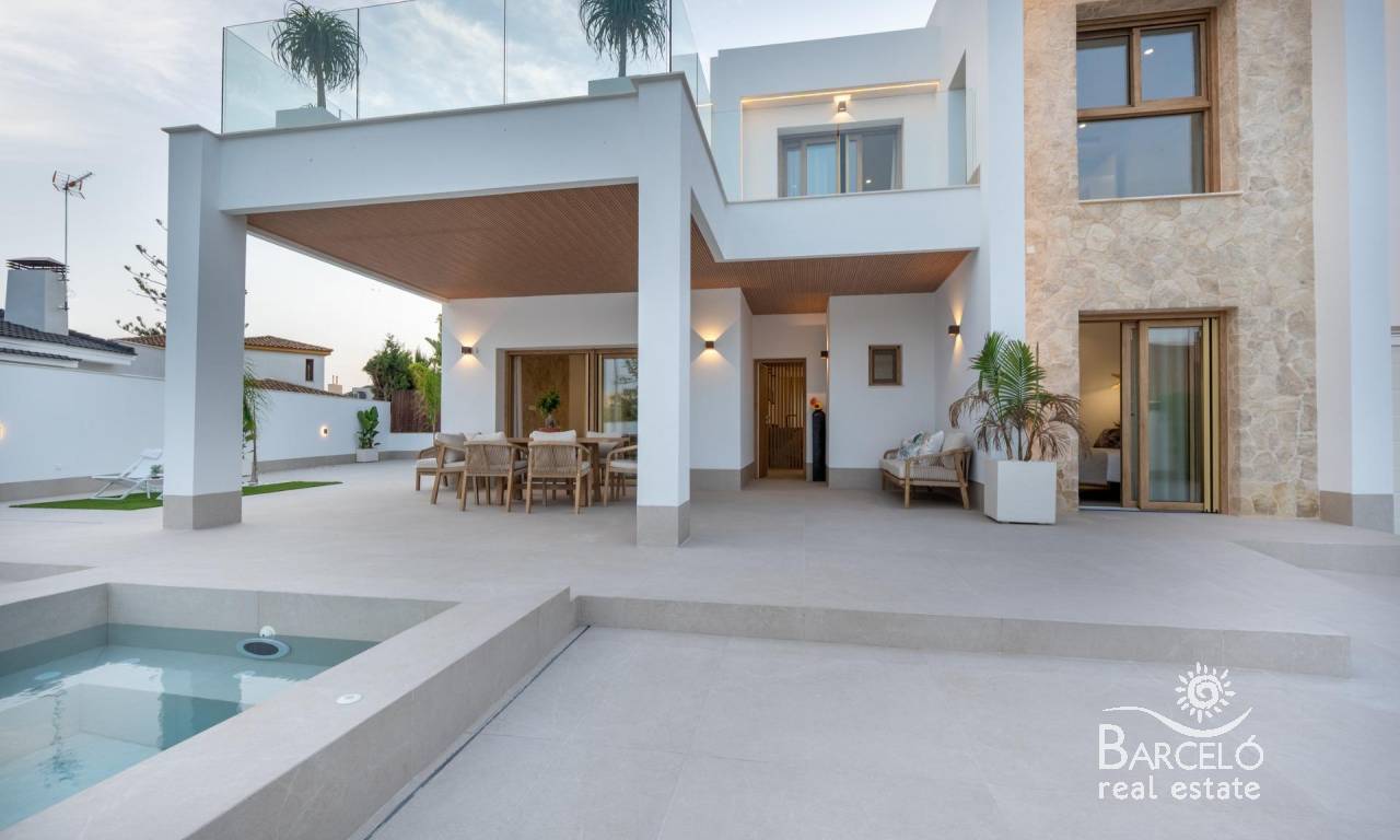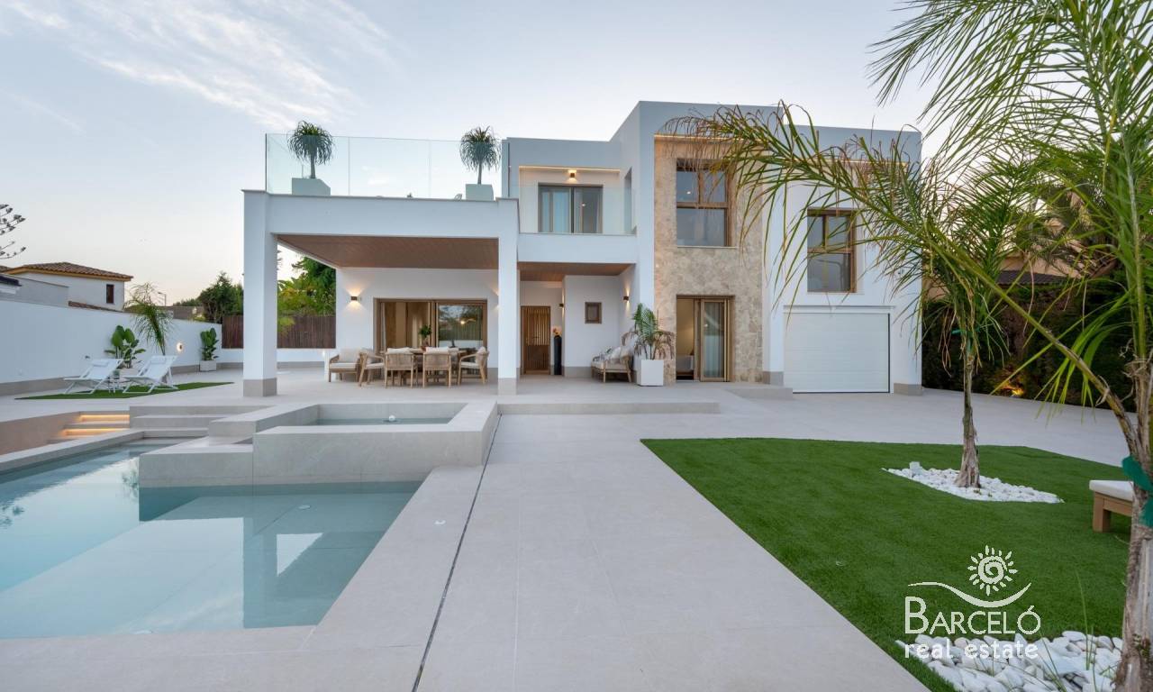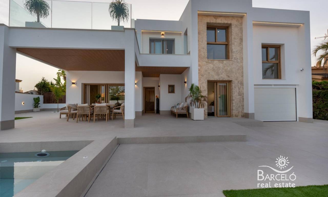 The villa includes two porches, a 47 m² private pool with jacuzzi and beach area, as well as a solarium on the upper floor. The chill-out area, set with LED lighting, creates the perfect environment for relaxation. The outdoor kitchen makes this villa the ideal place to enjoy the Mediterranean climate with family and friends.