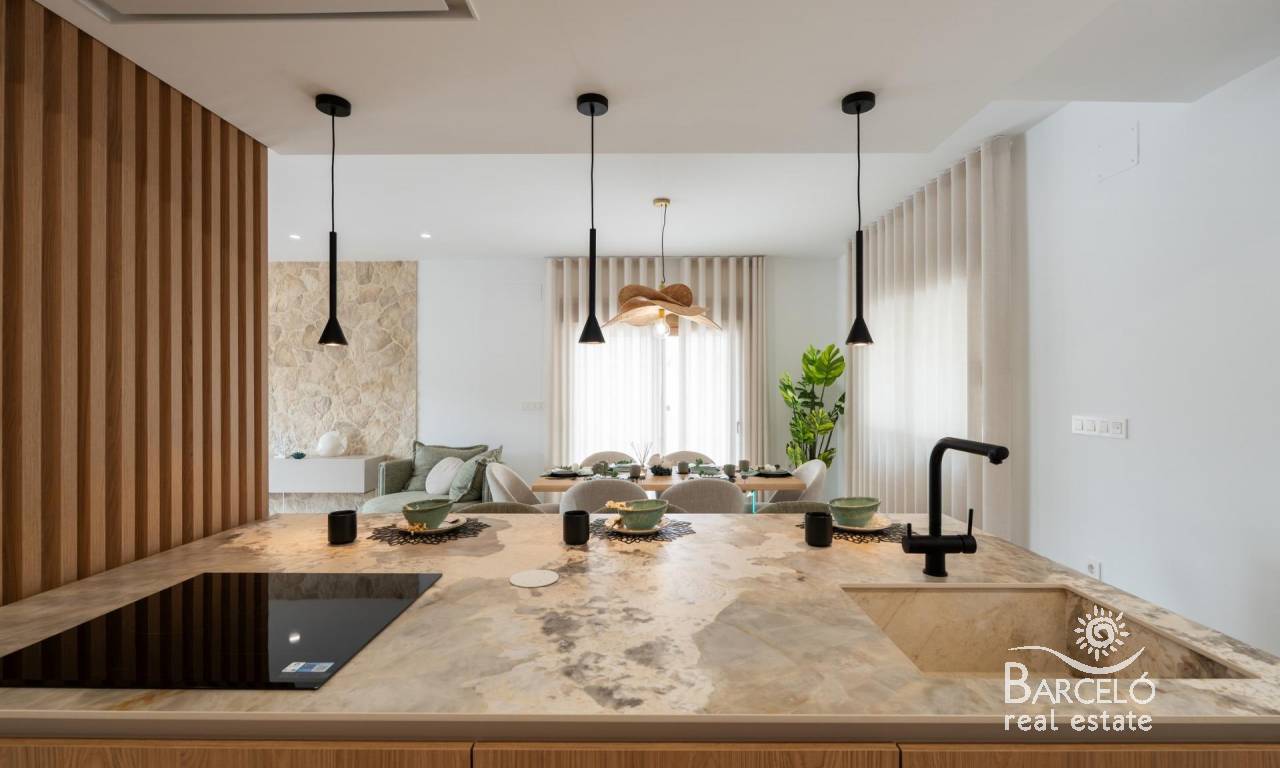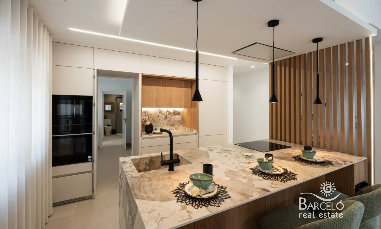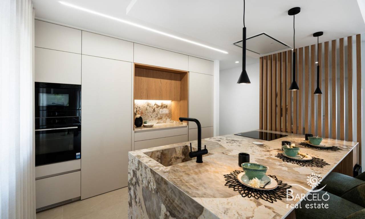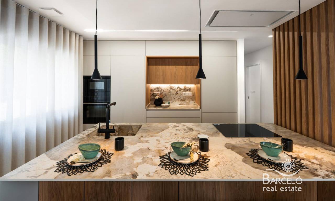 The kitchen, fully equipped with Bosch appliances, stands out for its central island decorated with wooden slats, LED lighting and a practical hidden door that gives access to the laundry room, garage and outdoor bathroom. The living room has large windows that visually connect with the outside, reinforcing the spaciousness of the space and creating a bright and welcoming atmosphere.