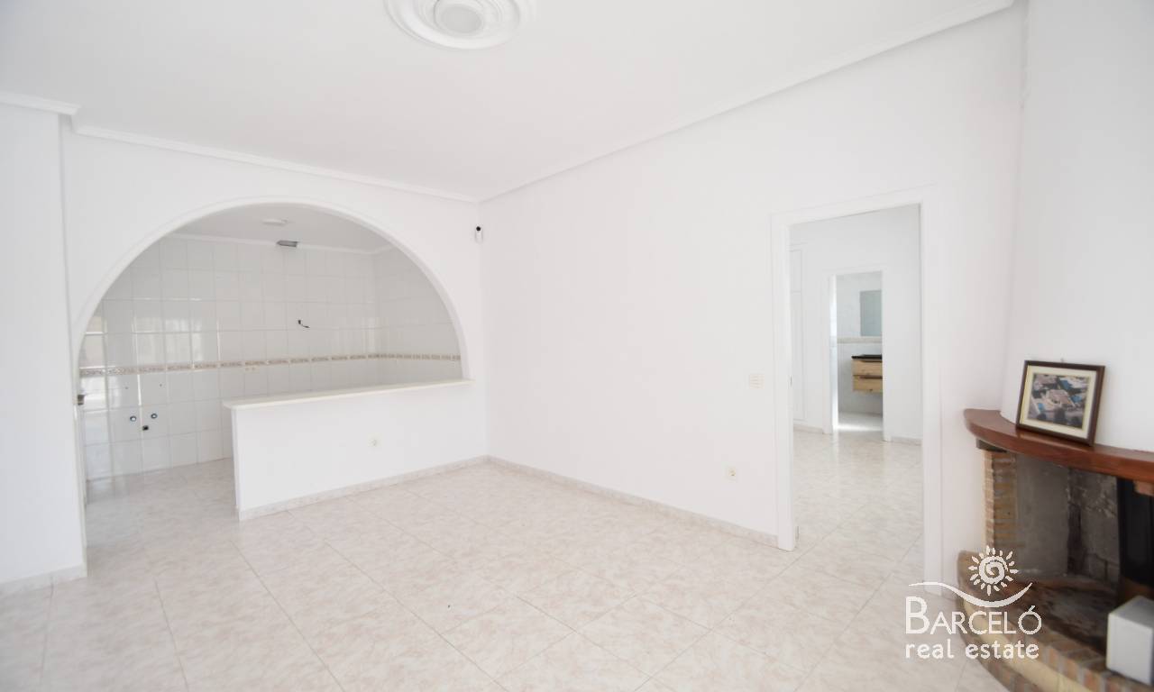 Heading into the villa you have your curved south facing terrace overlooking the pool area, which leads into the living room. In the living room you find a cosy fireplace, and the open plan kitchen needs fitting. There is also a dining room area which could be converted to a bedroom or used as another living room, and from here there is also access to the outside and the garden. There is a spacious master bedroom with an en suite bathroom, and two further double bedrooms and a family bathroom.