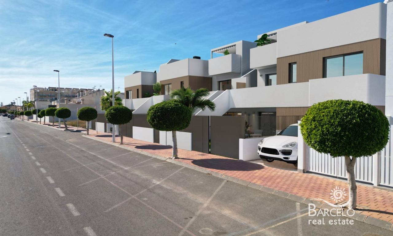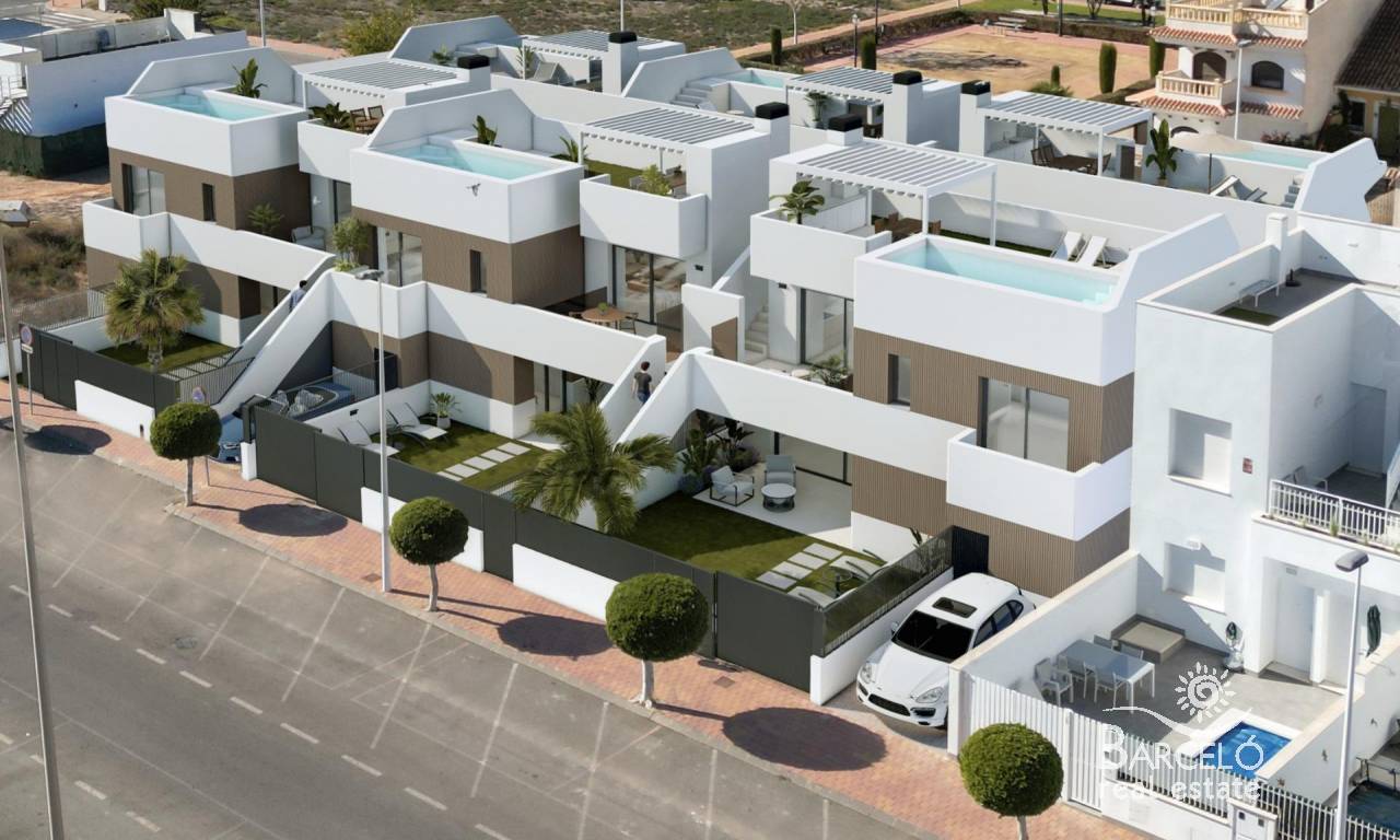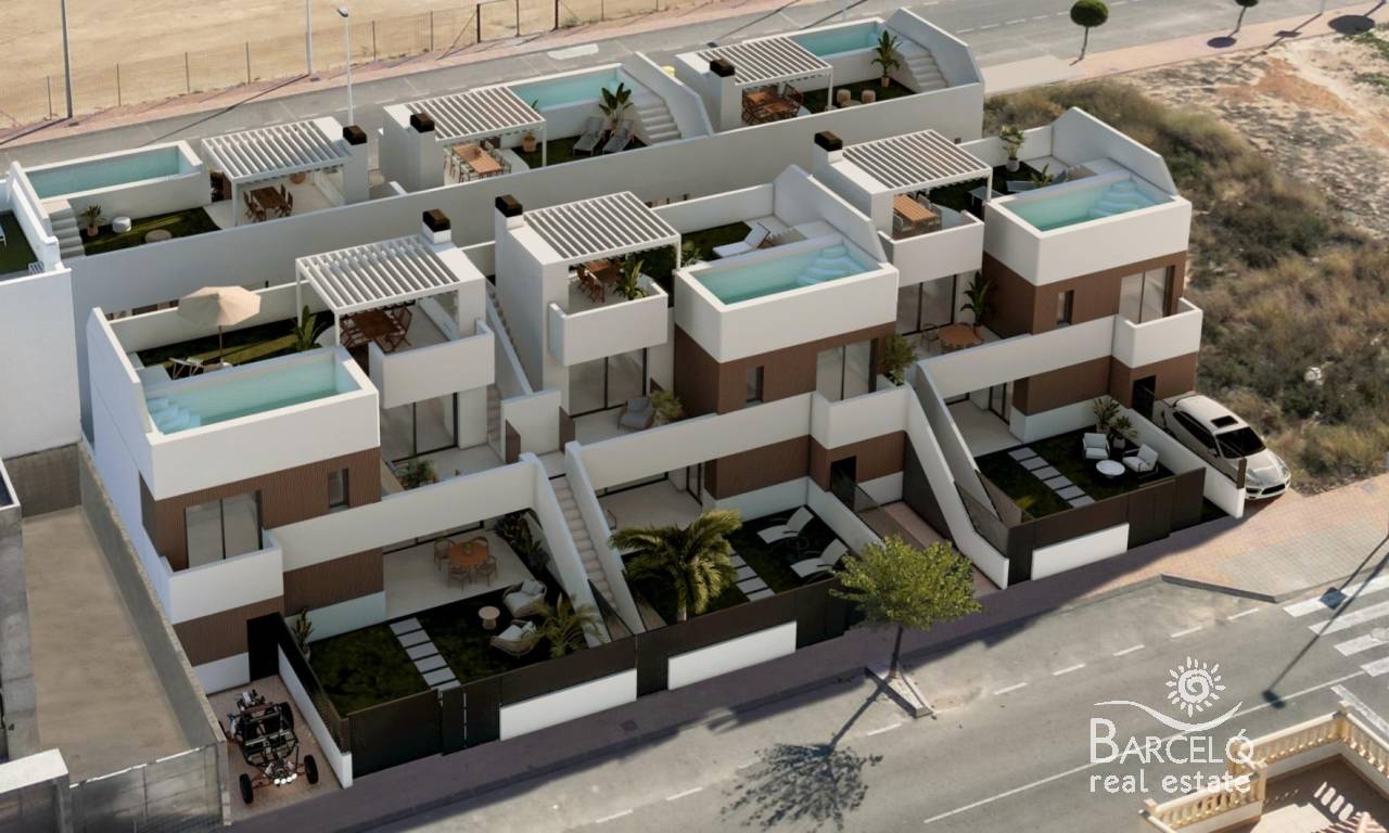 New Build Bungalows with Private Pool in San Pedro del Pinatar Exclusive Boutique Residences near the Beach This limited collection of 12 new build bungalows in San Pedro del Pinatar offers the perfect balance of modern design, Mediterranean lifestyle, and unbeatable location. Just 600 meters from the beach and within walking distance of shops, restaurants, and leisure facilities, these homes are ideal as a holiday retreat, investment, or permanent residence on the Costa Cálida. San Pedro del Pinatar is a charming coastal town situated between the Mar Menor and the Mediterranean Sea, known for its sailing clubs, natural mud baths in Lo Pagán, and vibrant promenade. With excellent connections, the town is only 30 km from Murcia–Corvera Airport, 75 km from Alicante Airport, and a short drive from Dos Mares Shopping Center (5 km) and several top golf courses within 10–20 km. Choose Between Garden or Penthouse Models This boutique project features two carefully designed layouts: Ground Floor Bungalows: Offering a front terrace, private pool, laundry area, rear patio, and on-plot parking. Penthouse Bungalows: Including a large terrace, private rooftop solarium with pool, plus ground-floor storage and a private parking space. Both models include 2 bedrooms and 2 bathrooms, with the master bedroom featuring an en-suite bathroom. The open-plan living and dining area connects seamlessly with a fully equipped kitchen, enhanced by large sliding doors that flood the interior with natural light. High-Quality Features for Comfort and Style Every home in this development is built with premium finishes to ensure both elegance and practicality. Key features include: Fully fitted kitchen with appliances (induction hob, oven, dishwasher, fridge/freezer) Pre-installed ducted air conditioning Internal and external LED lighting Electric shutters for added convenience Bathrooms fitted with furniture, mirrors, and lighting A Lifestyle by the Sea Living in San Pedro del Pinatar means enjoying a relaxed coastal atmosphere with all modern amenities nearby. The marina, just 1 km away, is perfect for sailing enthusiasts, while the calm waters of the Mar Menor provide year-round opportunities for swimming and water sports. Reserve Your Dream Bungalow in Costa Cálida With delivery scheduled for mid-2027, this is the perfect moment to secure your new home by the sea. Contact us today for more information or to arrange a visit, and start living the Mediterranean lifestyle you deserve.