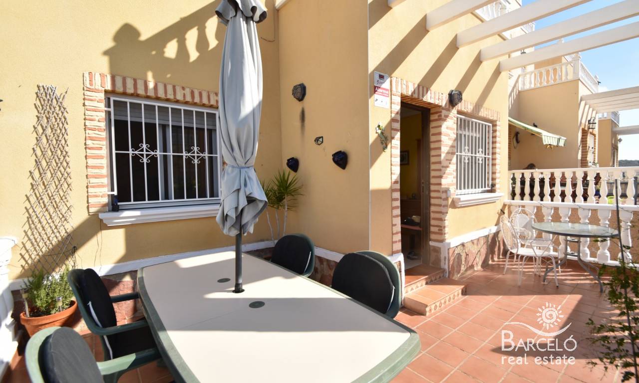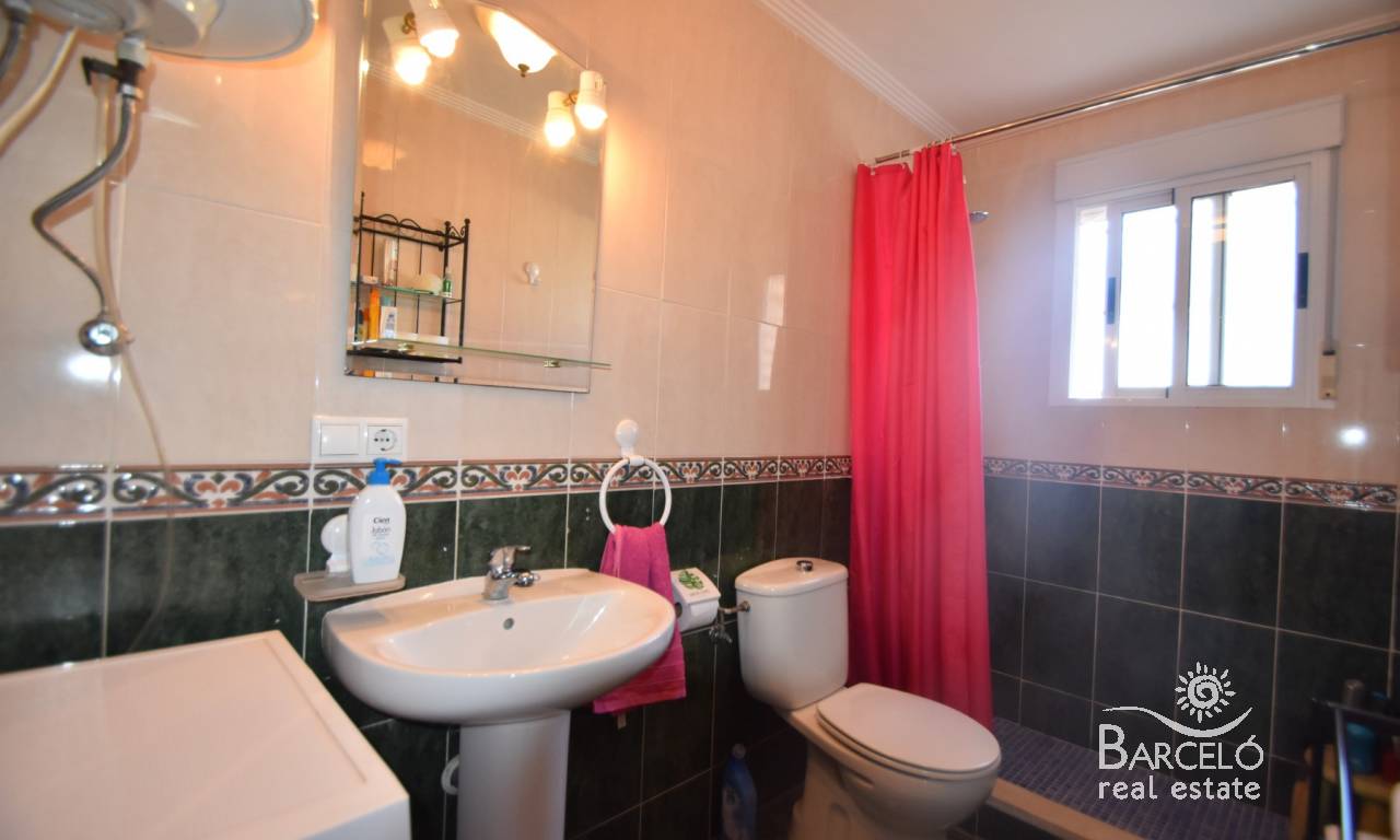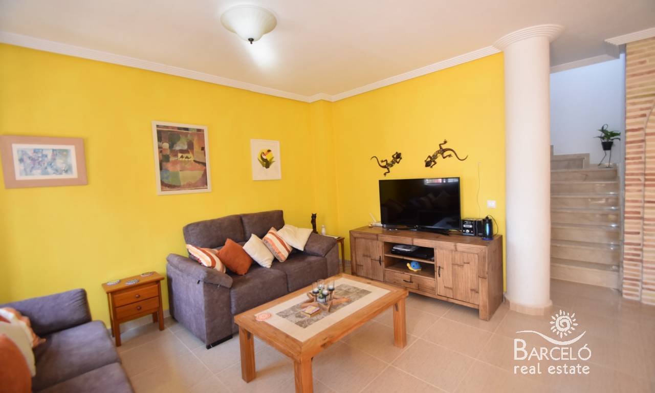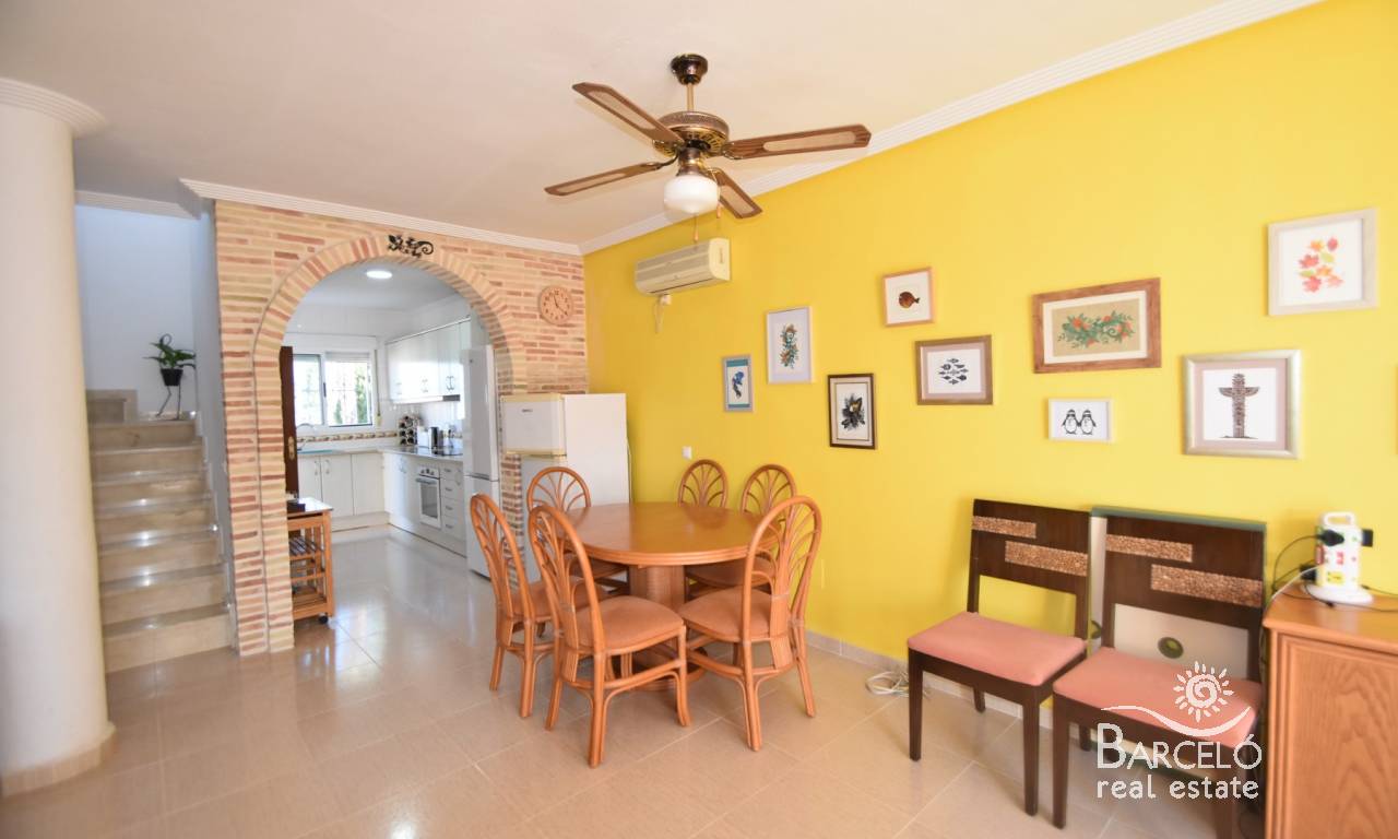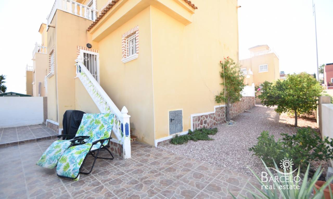 The property sits on a nice sunny plot, with a private access road and plenty of street parking outside. On the ground floor you have a terrace with space for seating, and the property can be accessed from the main front door and also a rear door through the kitchen. Downstairs you have a living room with air conditioning, a good size kitchen and a full bathroom and storage room.