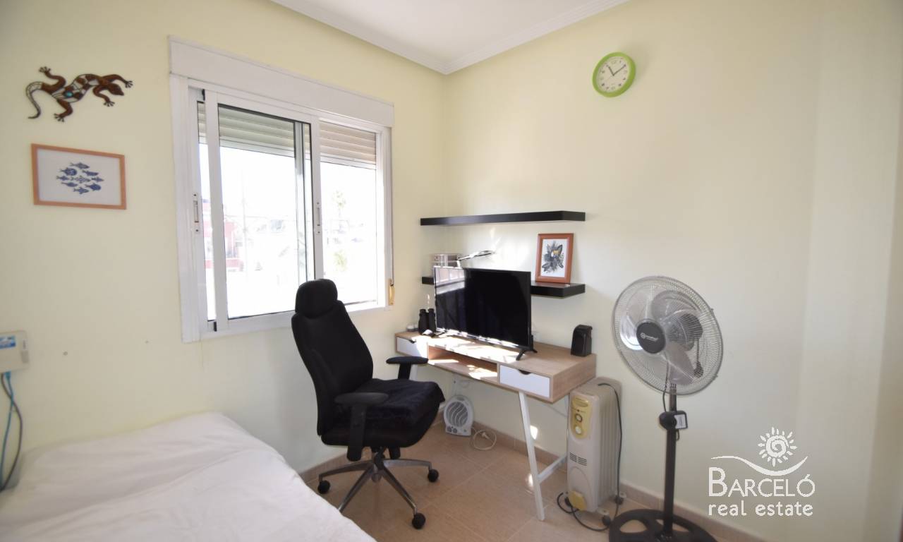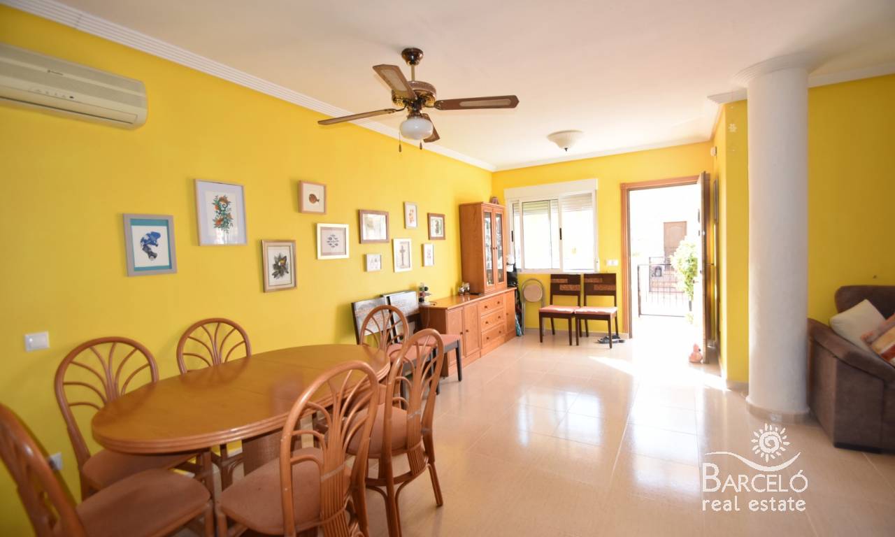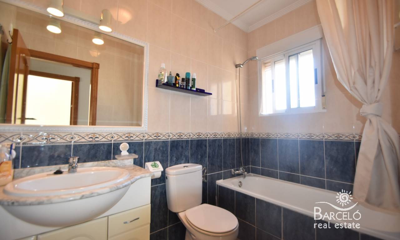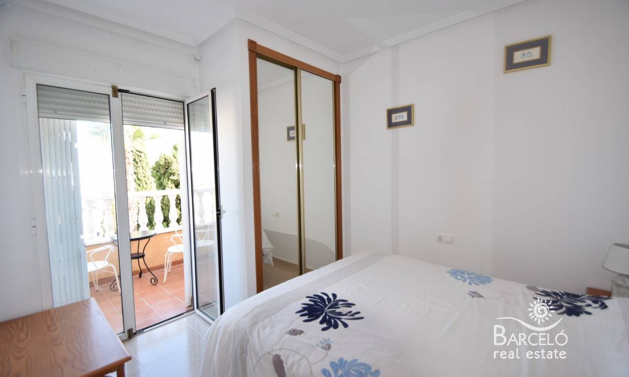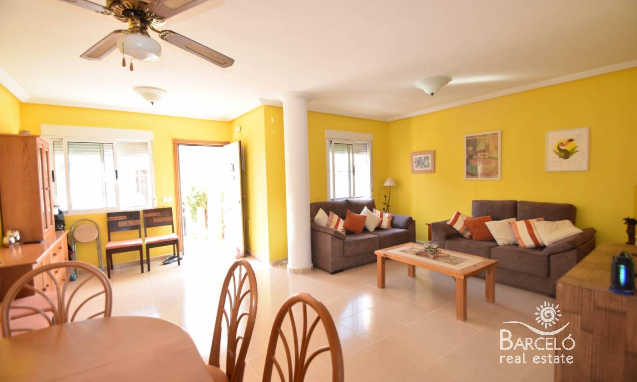 The property sits on a nice sunny plot, with a private access road and plenty of street parking outside. On the ground floor you have a terrace with space for seating, and the property can be accessed from the main front door and also a rear door through the kitchen. Downstairs you have a living room with air conditioning, a good size kitchen and a full bathroom and storage room.