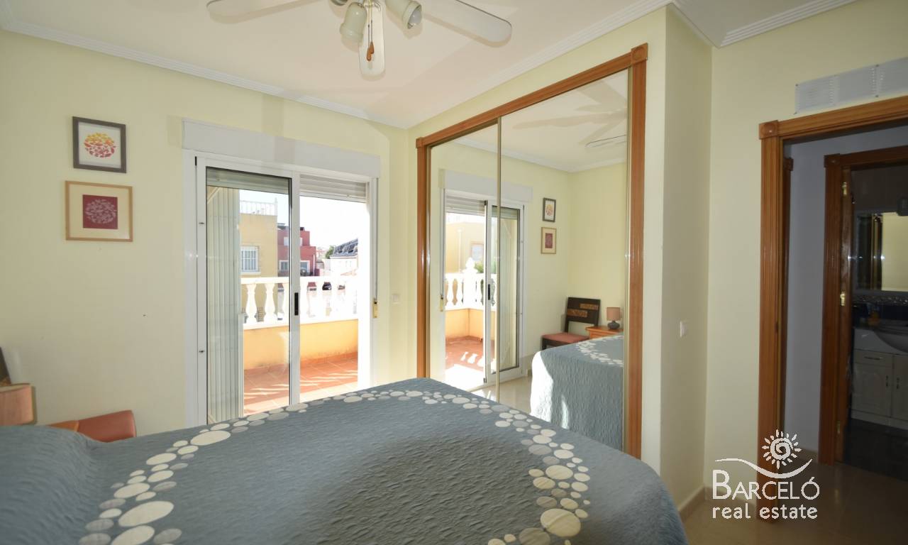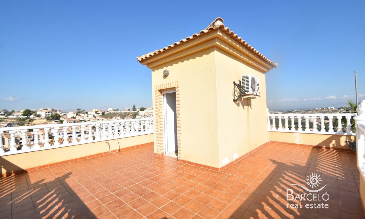 Upstairs there are three double bedrooms, each with built in wardrobes and air conditioning in the master bedroom. Two of the bedrooms also have their own sunny private terraces with lovely views. There is also a family bathroom on this floor. On the top level there is a large solarium, with views to the surrounding area and down towards the golf course and mountains.