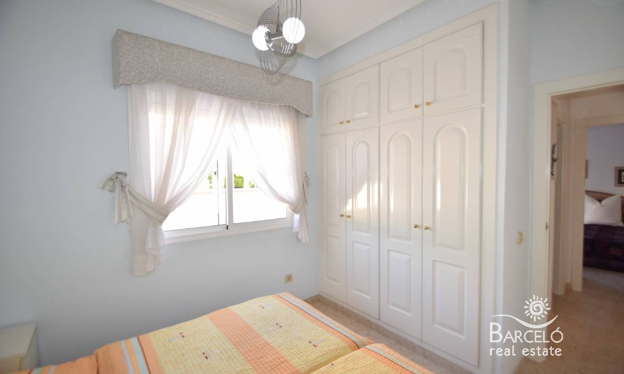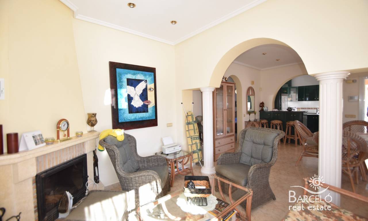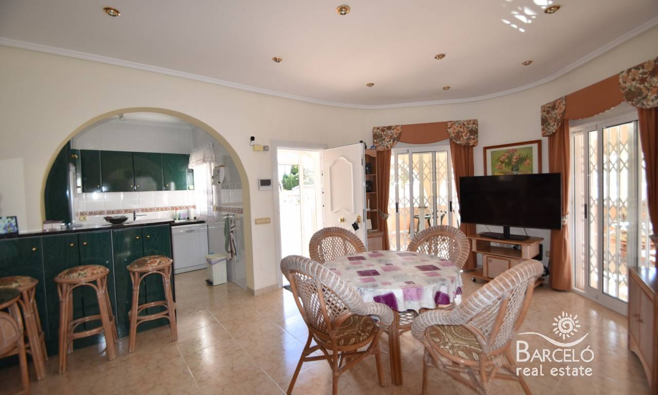 The south facing villa has a large wraparound terrace, which has been glazed in, perfect for the winter and summer months alike. Inside there is a spacious living room with a seperate dining area, and a fully fitted kitchen. There are two double bedrooms with wardrobes and a family bathroom. The property has air conditioning and is sold partially furnished.