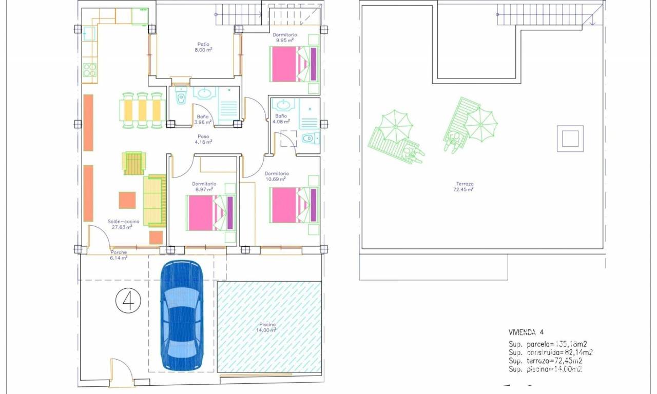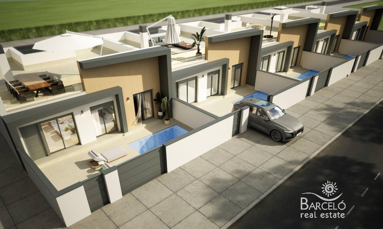 New Build Townhouses with Private Pool in Avileses, Murcia Modern Single Level Homes in a Peaceful Murcia Location This new residential development consists of five contemporary townhouses located in Avileses, a traditional Spanish village in the Region of Murcia. Known for its relaxed atmosphere and local charm, Avileses offers daily services, sports facilities and an authentic Mediterranean lifestyle while remaining close to golf resorts, beaches and major transport connections. The area is ideal for permanent living, holiday use or investment thanks to its excellent value and growing demand. Thoughtful Layout Designed for Outdoor Living All homes are built on one level and have been designed to enjoy sunshine throughout the year. Each property features a front terrace, a private rear patio and a spacious rooftop solarium, creating multiple outdoor areas for relaxation and entertaining. The private garden includes a swimming pool and on plot parking, ensuring comfort and privacy for every homeowner. Inside, the homes offer a practical and bright layout with three bedrooms and two bathrooms, including a master bedroom with en suite bathroom. The open and functional design enhances natural light and creates a welcoming living environment suitable for families and couples alike. High Quality Specifications and Modern Comfort These new build townhouses are delivered with high quality finishes and modern installations. The kitchens are fully furnished and equipped with Balay appliances including ceramic hob, oven, microwave, extractor hood, integrated fridge and integrated dishwasher. Bathrooms are fully fitted with suspended toilets, vanity units, mirrors, rain shower columns and shower screens. Additional features include motorized shutters on front facing windows, fitted wardrobes with drawers, LED interior lighting in kitchen, living area, hallway and bathrooms, and integrated LED lighting in garden walls and solarium. Hot water is produced by an aerothermal system, and pre installation for ducted air conditioning is included to ensure year round comfort. Excellent Location Near Golf, Beaches and Airport Avileses is surrounded by several renowned golf courses, making it an excellent choice for golf enthusiasts. La Torre Golf Resort is approximately 6 km away and Hacienda Riquelme Golf is around 7 km from the development. The Mar Menor and Mediterranean beaches are located about 15 km away, offering a wide range of water sports and leisure activities. Murcia International Airport is just 20 km away, while the city of Murcia is approximately 25 km, providing shopping, culture and gastronomy. A Smart Investment on the Costa Calida With modern design, private pools and an excellent location close to golf courses and beaches, these new build townhouses in Avileses offer outstanding value and lifestyle potential. Contact us today to receive more information or to arrange a viewing and secure your new home in Murcia.