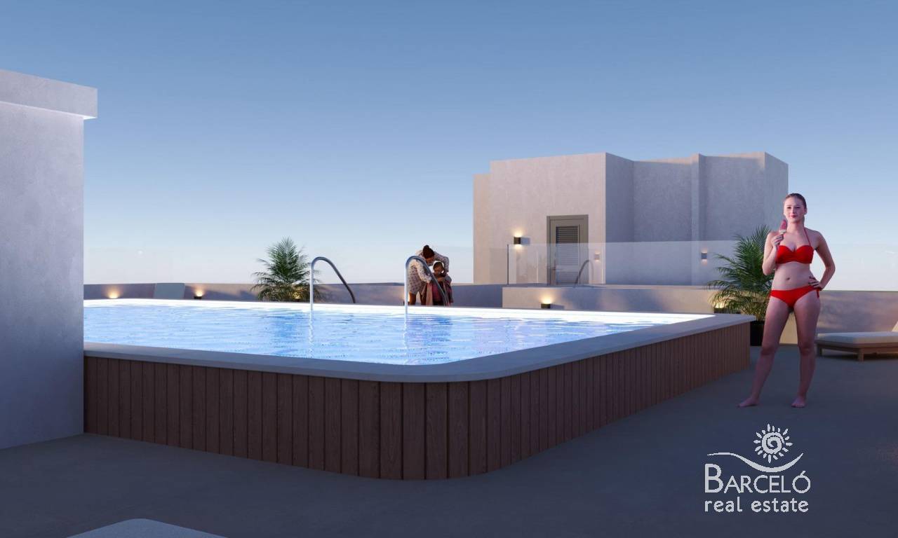 Modern New Build Apartments in the Center of San Miguel de Salinas Contemporary Living in a Healthy Mediterranean Environment Located in the charming town of San Miguel de Salinas, just 10 km from the Mediterranean Sea, this new residential development offers the perfect balance between modern comfort and natural surroundings. The area is well known for its nearby salt lakes and exceptional microclimate, considered one of the healthiest in Europe. This peaceful yet vibrant town allows residents to enjoy the authentic Mediterranean lifestyle while being within walking distance of shops, restaurants, supermarkets and all essential services. San Miguel de Salinas sits slightly inland on the Costa Blanca South, offering open views, fresh air and easy access to beaches, golf courses and shopping areas. Stylish Apartments Designed for Comfort and Efficiency The project consists of two modern buildings separated by a landscaped communal garden area. A total of 56 contemporary apartments are available with 1, 2 or 3 bedrooms, each featuring a private terrace. Every home has been designed with comfort, aesthetics and energy efficiency in mind, using high quality materials and modern insulation systems. Each apartment includes: Armored entrance door Bathrooms with vanity units Pre installation of ducted air conditioning Energy certificate rating A The layout and orientation of the homes ensure natural light throughout the day, creating bright and welcoming interiors ideal for both permanent living and holiday use. Exceptional Communal Areas for Relaxation and Social Life The ground floor communal space is designed as the social heart of the development, surrounded by landscaped gardens, seating areas, bicycle parking and a children’s playground. It is an ideal meeting point for residents of all ages. On the rooftop, an impressive 350 m2 leisure area awaits. This space includes a 70 m2 swimming pool with a separate children’s splash area, pergolas, sun loungers and shaded areas, allowing residents to relax while enjoying panoramic views. The rooftop is easily accessible by one of the three lifts and includes sanitary facilities for added comfort. Excellent Location Close to Key Points of Interest Mediterranean beaches 10 km Zenia Boulevard Shopping Center 9 km Villamartin Golf 6 km Las Colinas Golf 8 km Torrevieja Marina 12 km Alicante Airport 60 km Murcia Corvera Airport 55 km A Smart Investment in Costa Blanca South This residential complex combines modern architecture, quality finishes and a prime central location, making it an excellent choice for living, holiday enjoyment or rental investment. Contact us today for more information or to arrange a visit to these modern apartments in San Miguel de Salinas.