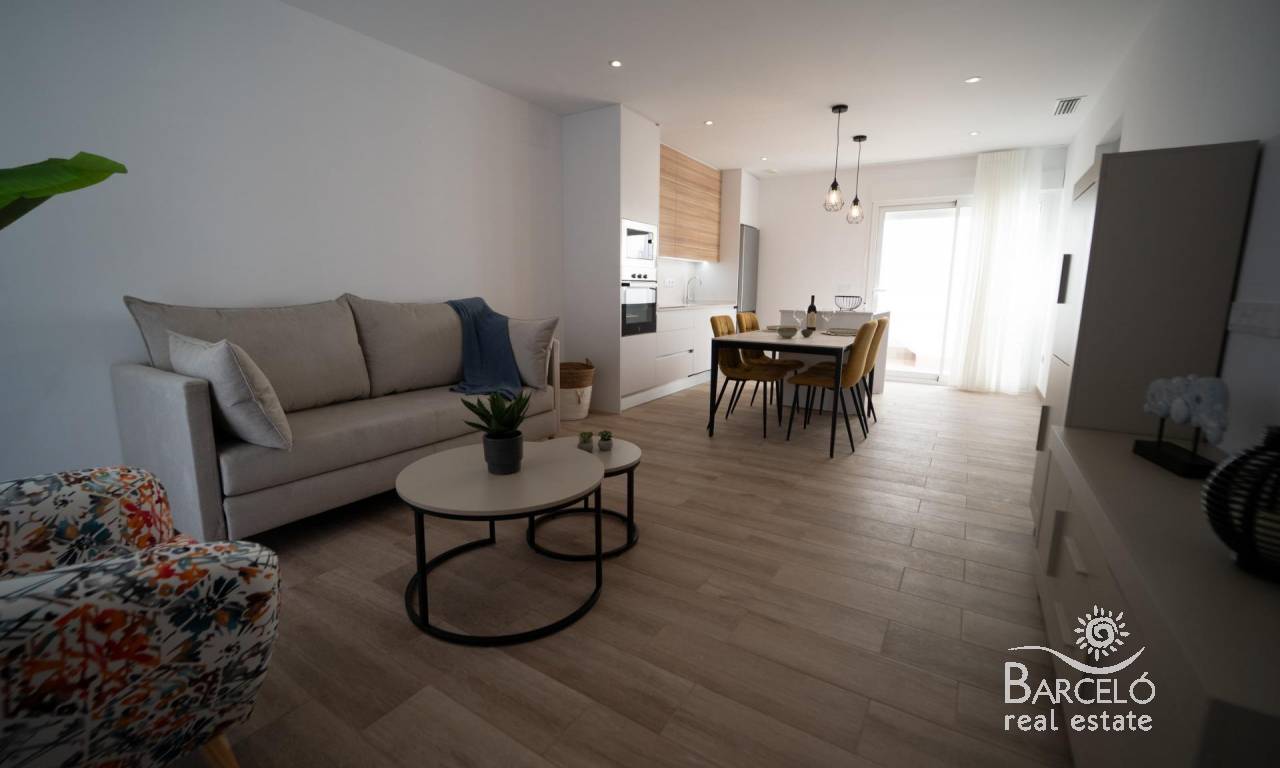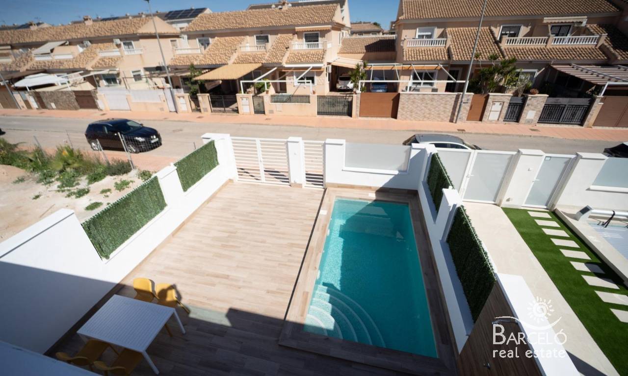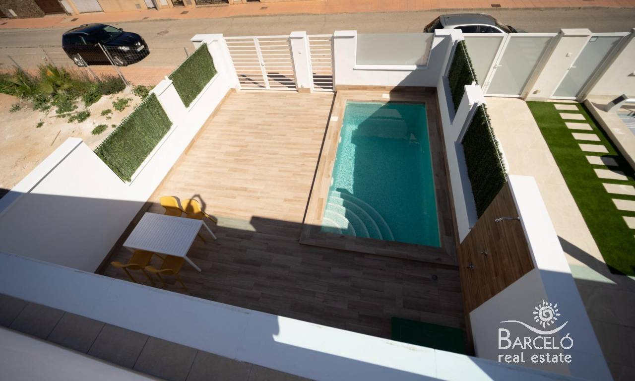 NEW BUILD TOWNHOUSES IN SAN JAVIER New Build luxury complex of 24 one level villas or on 2 floors with private pool, terraced area and solarium with Summer kitchen that allows you to enjoy all hours of sunshine, every day of the year. Each villa has 2 or 3 bedrooms and 2 fitted bathrooms on one level or 3 bedrooms and 3 fitted bathrooms on two levels. Designed with a contemporary style and open planned concept, comprising a fully-fitted kitchen and lounge-dining room. The development is located in San Javier (Murcia), near the beach, surrounded by services, parks, sports facilities and several Golf Courses. The property will meet the highest standards and will be equipped with: Private swimming pool with shower. Kitchen completely furnished and equipped with oven, microwave, fridge, integrated dishwasher, hob and extractor fan. Lighting: inside the property (dining room, kitchen, corridors and bathrooms) as well as in outdoor areas. Lined wardrobes with drawers. Fully fitted bathrooms with toilet, vanity unit, mirror and shower with screen panels. Pre-installation for ducted air conditioning. Solarium with Summer kitchen. Parking space on the plot. San Javier is close to all amenities with easy access to the beach, water sports, shops and the transport network. Here you can enjoy all of the facilities that San Javier has to offer such as the local shops, bars and restaurants as well as being near to shopping centres, the airport of Murcia and all of the beautiful places to be found along the Mar Menor. Corvera/Murcia airport is 30 minutes away and Alicante airport is 45 minutes away.