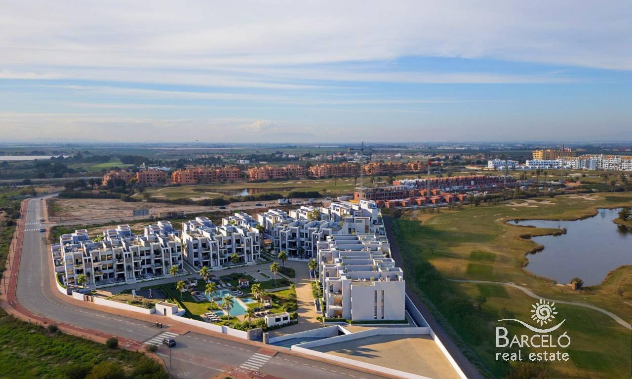 New Build Resort Apartments at La Serena Golf-Los Alcazares Near the Beach Modern Golf Front Living on the Costa Calida Discover this exclusive new build residential resort located at La Serena Golf in Los Alcazares. This contemporary development features 66 stylish apartments with 2 or 3 bedrooms and 2 bathrooms, one of them en suite, designed to offer comfort, elegance and an exceptional Mediterranean lifestyle just 300 meters from the Mar Menor. Los Alcazares is a charming coastal town known for its relaxed atmosphere, sandy beaches and long seaside promenade. With more than 300 days of sunshine per year, the area offers a perfect environment for outdoor living, water sports and golf. The town also provides a wide selection of restaurants, shops, marinas and sports facilities, making it a highly desirable destination for both permanent residence and holiday homes. Apartments with Terraces, Gardens and Private Solariums The residential complex offers several property types to suit different lifestyles. Buyers can choose between ground floor apartments with private gardens, middle floor homes with spacious terraces or penthouses with terraces and large rooftop solariums. The solariums include an outdoor shower and offer the option to add a summer kitchen and private jacuzzi, creating an ideal space for relaxation and entertaining while enjoying open views of the golf course and surrounding landscape. Each home has been designed with bright interiors and open plan living spaces that connect seamlessly with the outdoor areas. Resort Style Amenities and Exceptional Communal Areas One of the most distinctive features of this development is its resort style concept. Residents can enjoy a spectacular lagoon style swimming pool of approximately 190 m2 with beach style access and relaxing areas with Balinese beds. Additional communal facilities include landscaped gardens, a spa area, gym and sauna located in the basement level. The complex also offers a children playground, two petanque courts and communal restrooms near the pool area, creating a welcoming environment for residents and guests. Quality Finishes and Modern Features The apartments are built with modern materials and high quality specifications designed for comfort and style. Fully equipped kitchen with white glass finish appliances Bathrooms with vanity units, shower screens and backlit mirrors Motorized window shutters Basic lighting package Fully installed ducted air conditioning Underground parking space for each property Underground bicycle parking and optional storage rooms Prime Location Close to Beach and Golf Mar Menor beach 0.3 km La Serena Golf next to the development Los Alcazares town center 2 km Cartagena 22 km Murcia 40 km Region de Murcia International Airport 30 km Alicante Elche Airport 90 km The calm and shallow waters of the Mar Menor are ideal for swimming, sailing and paddle surfing throughout the year. Secure Your Home at La Serena Golf Resort These modern apartments combine beachside living, golf views from most units and resort style amenities in one of the most attractive areas of the Costa Calida. Contact us today to receive more information or arrange a visit and secure your new home in La Serena Golf-Los Alcazares.