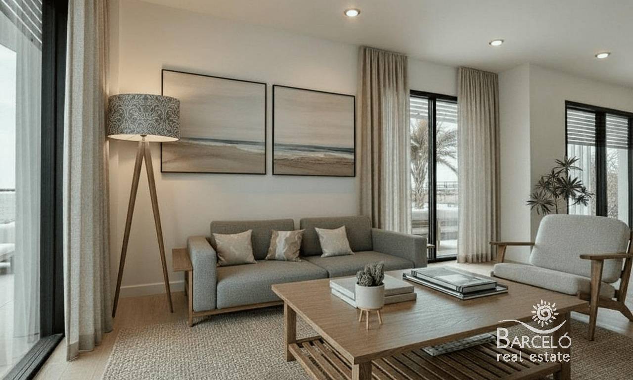 Luxury Golf Front Apartments Near the Sea in Los Alcazares Costa Calida Exclusive New Build Apartments in La Serena Golf Discover this exceptional new residential development located frontline to La Serena Golf in Los Alcazares, just 700 meters from the Mar Menor beaches. This modern complex offers 28 luxury apartments designed to provide maximum comfort, natural light and a high quality Mediterranean lifestyle. The building features a distinctive J shaped design with a curved facade, carefully oriented to enhance sunlight exposure and open views over the golf course and surrounding landscape. Its prime location combines the tranquility of a golf environment with close proximity to the sea and town center. Modern Apartments with Spacious Terraces and Solariums The development offers stylish two and three bedroom apartments, all with two bathrooms including an en suite. Each property has been designed to maximize outdoor living, a key element of life on the Costa Calida. Ground and first floor apartments feature large private terraces, perfect for outdoor dining and relaxation. Top floor properties benefit from generous private solariums, complete with a summer kitchen, offering an ideal space to enjoy the sun all year round. Elegant Interiors and High Quality Finishes Inside, the apartments combine modern design with functional layouts. Open plan living areas connect seamlessly with outdoor spaces, creating bright and comfortable environments. The kitchens come fully equipped with appliances, while bathrooms are delivered complete with vanity units, mirrors and shower screens. Additional features include a reinforced security entrance door, aerothermal system for hot water, LED lighting package and pre installation for ducted air conditioning. Communal Areas Designed for Relaxation Residents can enjoy a large communal swimming pool surrounded by beautifully landscaped gardens, providing a peaceful setting to relax and socialize under the Mediterranean sun. Each apartment also includes a private parking space and storage room in the underground garage, ensuring convenience and security. Prime Location Close to Golf, Beach and Services This development is ideally located just 700 meters from the beach and approximately 1.5 km from the center of Los Alcazares, where you will find a wide range of restaurants, shops, cafes and essential services. Los Alcazares is a popular coastal town known for its relaxed atmosphere, long promenades and warm shallow waters. Key distances include Murcia International Airport 35 km, Alicante Airport 95 km, La Serena Golf at your doorstep, Roda Golf 4 km and Cartagena city 25 km. Ideal Investment or Holiday Home on the Costa Calida These golf front apartments offer an excellent opportunity to own a modern property in a privileged location close to both the sea and golf. Contact us today to receive more information or to arrange a viewing and secure your new home in Los Alcazares.