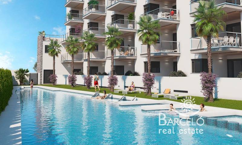 This apartment has a bright living room with balcony access, independent and fully equipped kitchen with access to the outside laundry area, bathroom with bath and two bedrooms with fitted wardrobes. Outside is a communal pool with shadow areas and parking spaces for residents.
