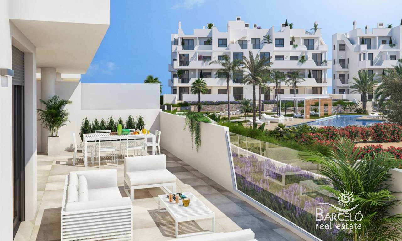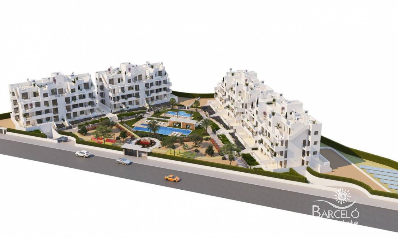 NEW BUILD RESIDENTIAL IN PRIVATE GATED RESORT IN PROVINCE OF MURCIA New Build residential complex has 60 apartments distributed in 4 blocks with terraced area for ground, first and second floors, community swimming pool, heated swimming pool and solarium with Summer kitchen on the penthouses, to enjoy all hours of sunshine every day of the year. The properties have 2 bedrooms and 2 bathrooms as well as parking space and storage room in the basement. These homes are designed with a contemporary style and open planned concept, comprising a fully-fitted kitchen and lounge-dining room. The properties will meet the highest standards and included: Kitchen completely furnished and equipped with oven and microwave in column, integrated fridge and dishwasher, induction hob and extractor fan. LED Lighting: inside the property (dining room, kitchen, corridors and bathrooms), and as well as in outdoor areas. Lined wardrobes with drawers. Motorised blinds in bedrooms. Heated floors in bathrooms. Fully fitted bathrooms with toilet, vanity unit, mirror, shower with rain effect and screen panels. Pre-installation for ducted air conditioning. Pre-installation of charging point for electric vehicles. Solarium with Summer kitchen, with pre-installation for electric appliances. Community swimming pool. Heated swimming pool. Parking space and storage room in the basement. Located in a private gated resort, with a main access entrance and 24 hours security. The resort is designed around an impressive 126.000 m2 green area. It comprises walking and cycling paths, sport facilities, paddle and tennis courts, a mini-golf course, gardens, dog parks, leisure areas, clubhouse…. Also in the central area is the jewel of the resort, a crystal-clear artificial lake of almost 17.000m2 of water surface, surrounded by white sandy beaches and palm trees, bringing a piece of the Caribbean to the Murcia Region. There are 2 islands in the lake, one of them has its own bar, there are also “beach Chiringuitos” spread around the lake. The resort is strategically located less than 4 km from the beach and the town of Los Alcázares, where you can practice various water sports, surrounded by several golf courses and the city of Cartagena less than 15 minutes by car and 22 km from Murcia airport, therefore having a wide cultural, gastronomic and sports offer within reach.
